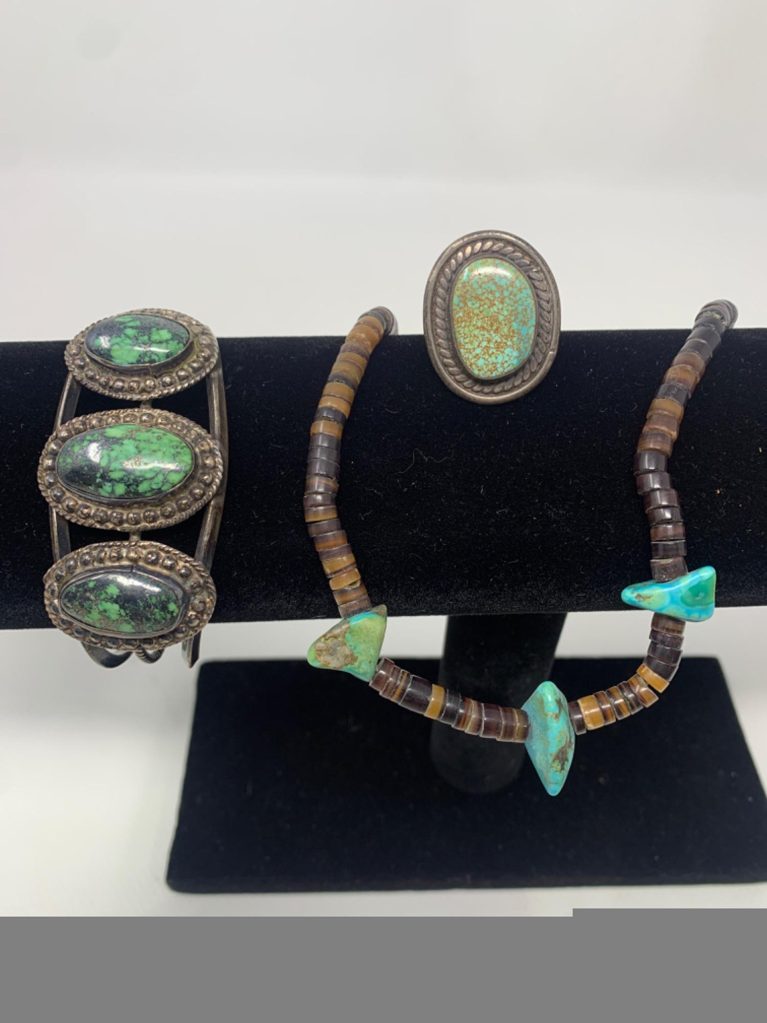 Vintage sterling silver and turquoise jewelry. Turquoise and quill necklace. Beautiful green, brown and blue colors. Ring is size 9. Two bands look disconnected.