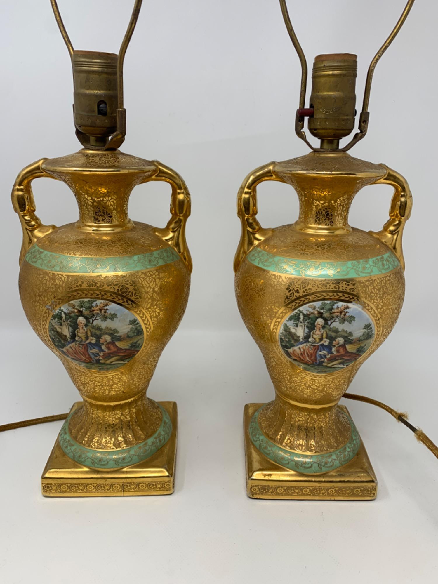 LeMieux 24K gold gilt china lamps. Vintage insulated power cords. See pics for condition. Beautifully painted and carved. No lightbulbs to test. Painted colonial scene.