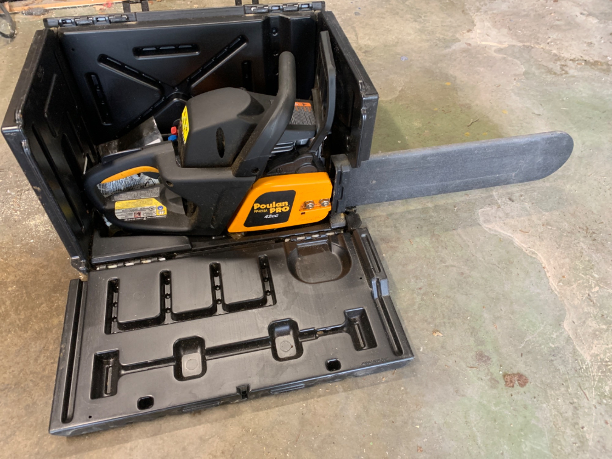 Poulon gas powered chainsaw. Model PP4218A. Includes extra chain, carrying case and tool. 17in blade