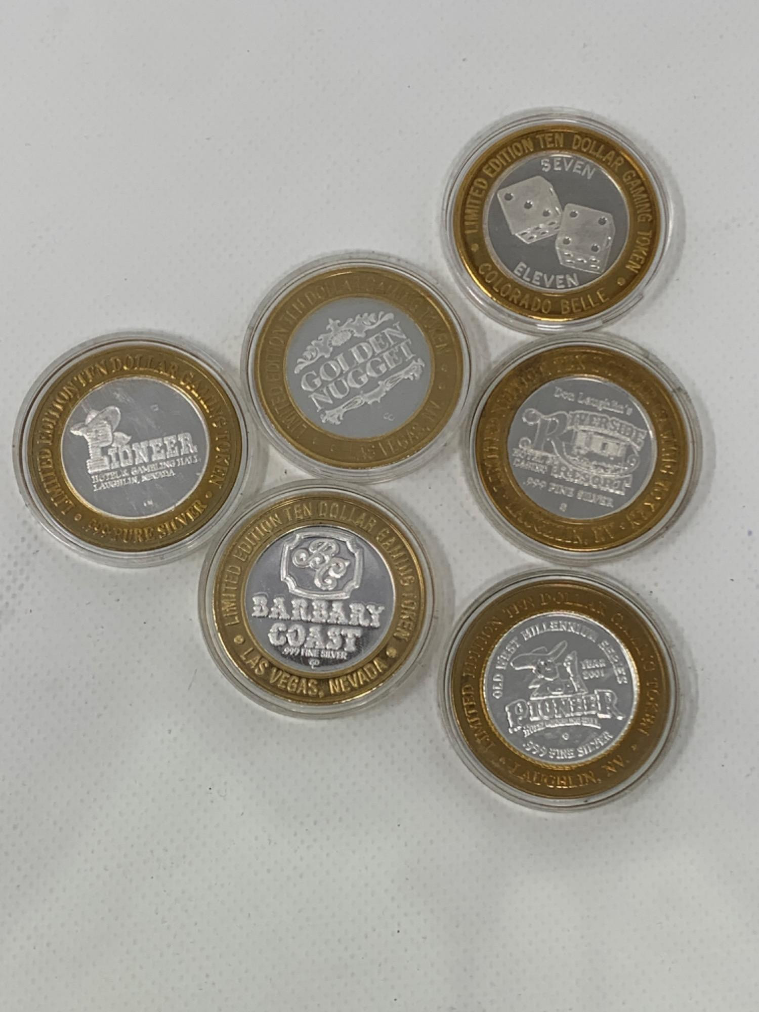 Protective plastic cases. Six coins in total. .999 silver centers. Limited edition $10 gaming coins. Weight is 224g