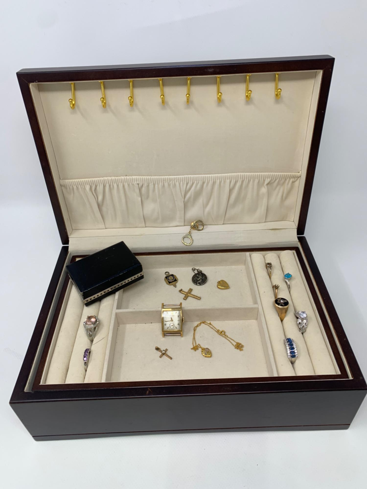 Gold filled locket. Two 14k gold bands, missing stones. Size 7/7.5. Gold and diamond crucifix, stone not authenticated. Gruen 10k gold filled watch face. Inscribed for MLB player Bobby Adam’s. Assorted fashion jewelry and beautiful inlaid jewelry chest. A few pieces added. To include some Sterling.