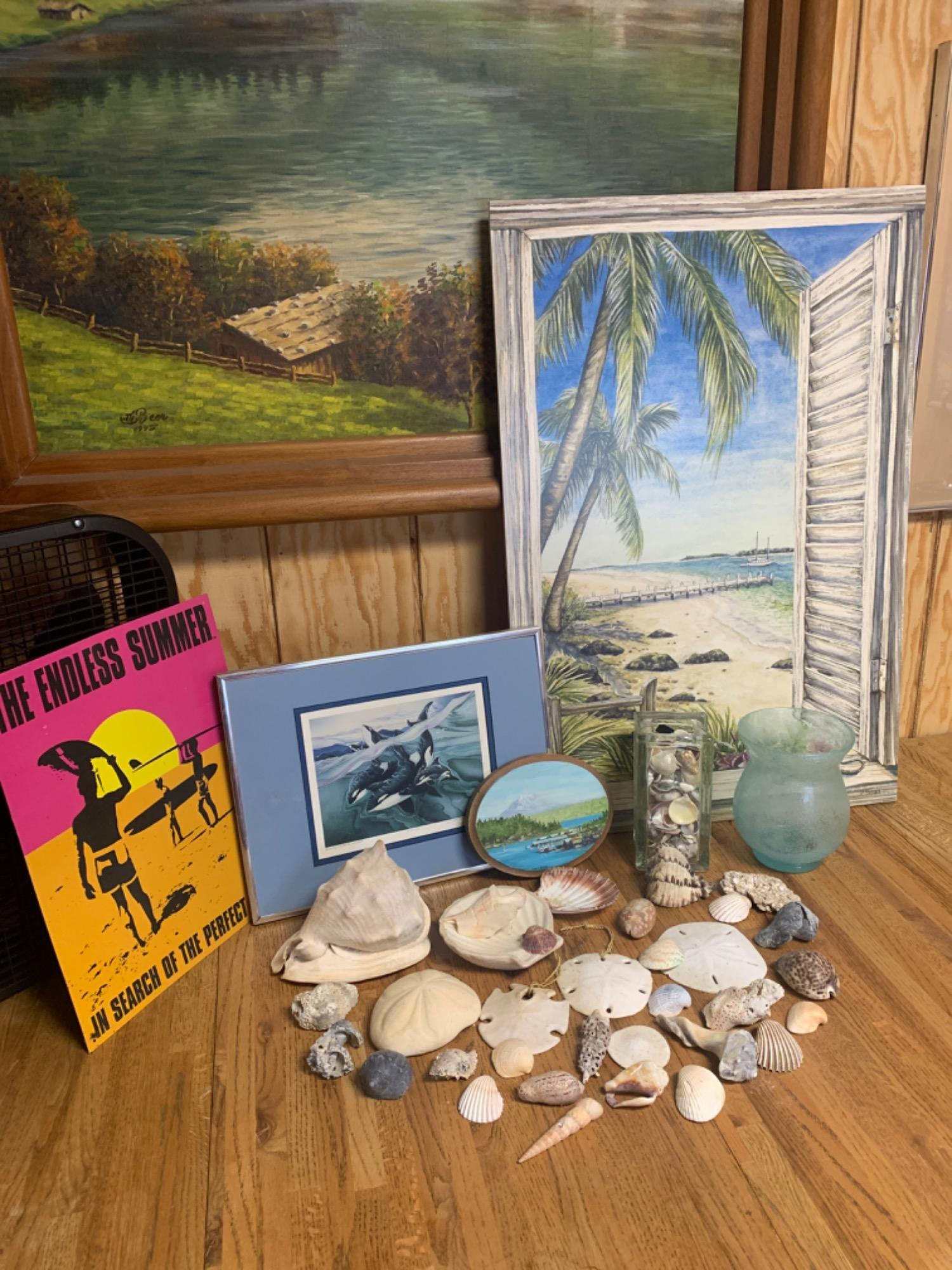Large shell collection with great pieces. Metal surf wall art. Jar full of shells. Hand painted wall art with marina on the sound/mountain. Large print dimensions are 22 inches wide, 33 inches tall. Framed orca print, signed by artist.