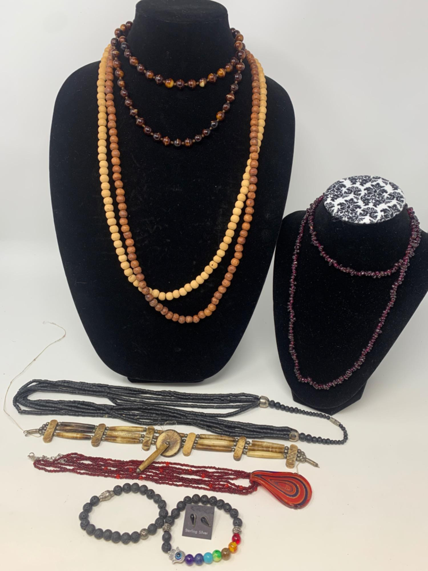 Two long strands wood beads. Third strand is synthetic material. Native American bone choker. Synthetic beaded necklace with large pendant. Two stone bracelets. Black stone and sterling silver earrings. Glass nut bead necklace. Cedar keepsake box.