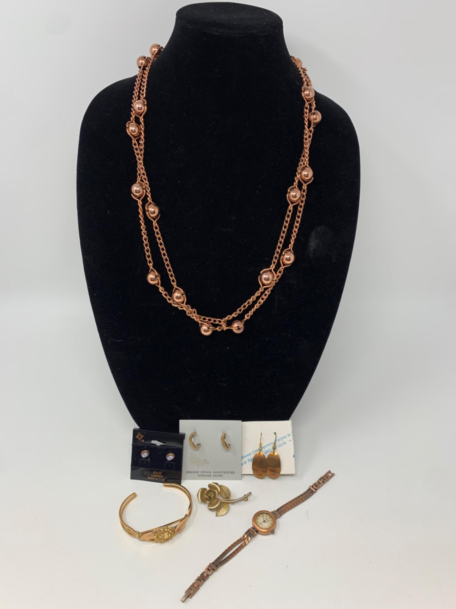 Several copper jewelry pieces. Watch, pin, bracelet, earrings and necklace.