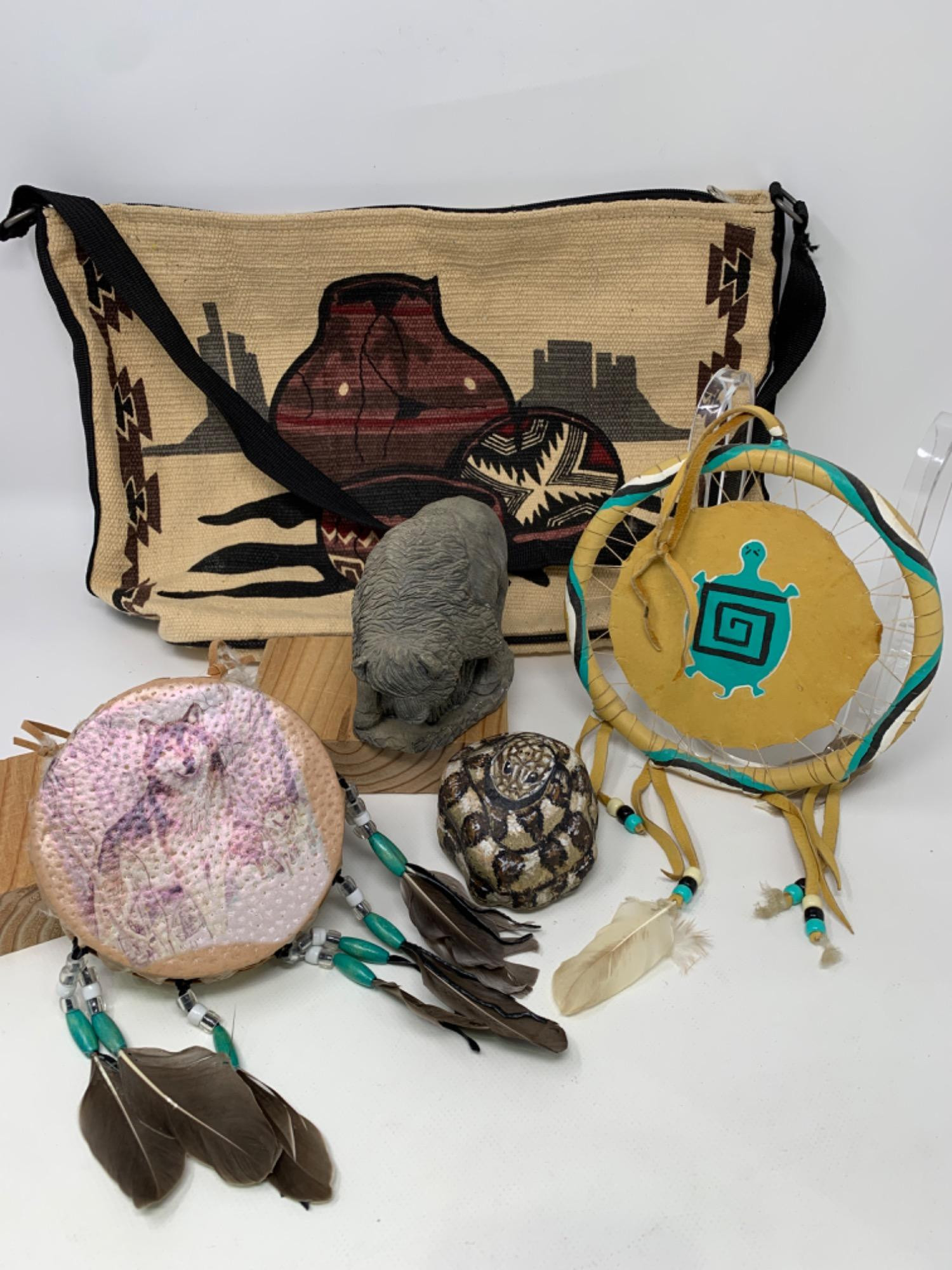 Woven bag, painted rock, drum, sun catcher, resin Bison statue