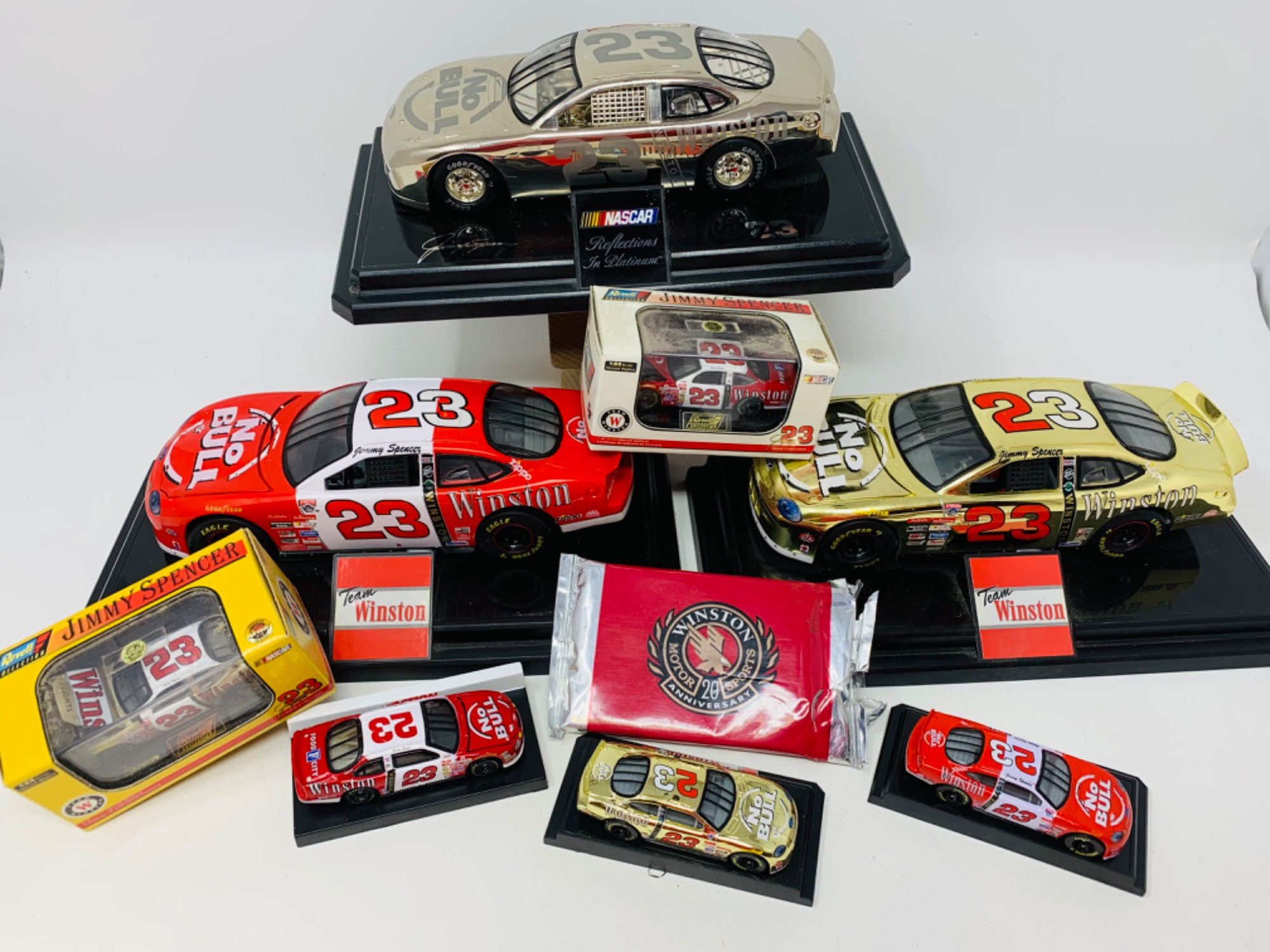 Large NASCAR die cast cars and assorted Winston brand memorabilia. Most cars have original box and more items were added. Two platinum series cars.