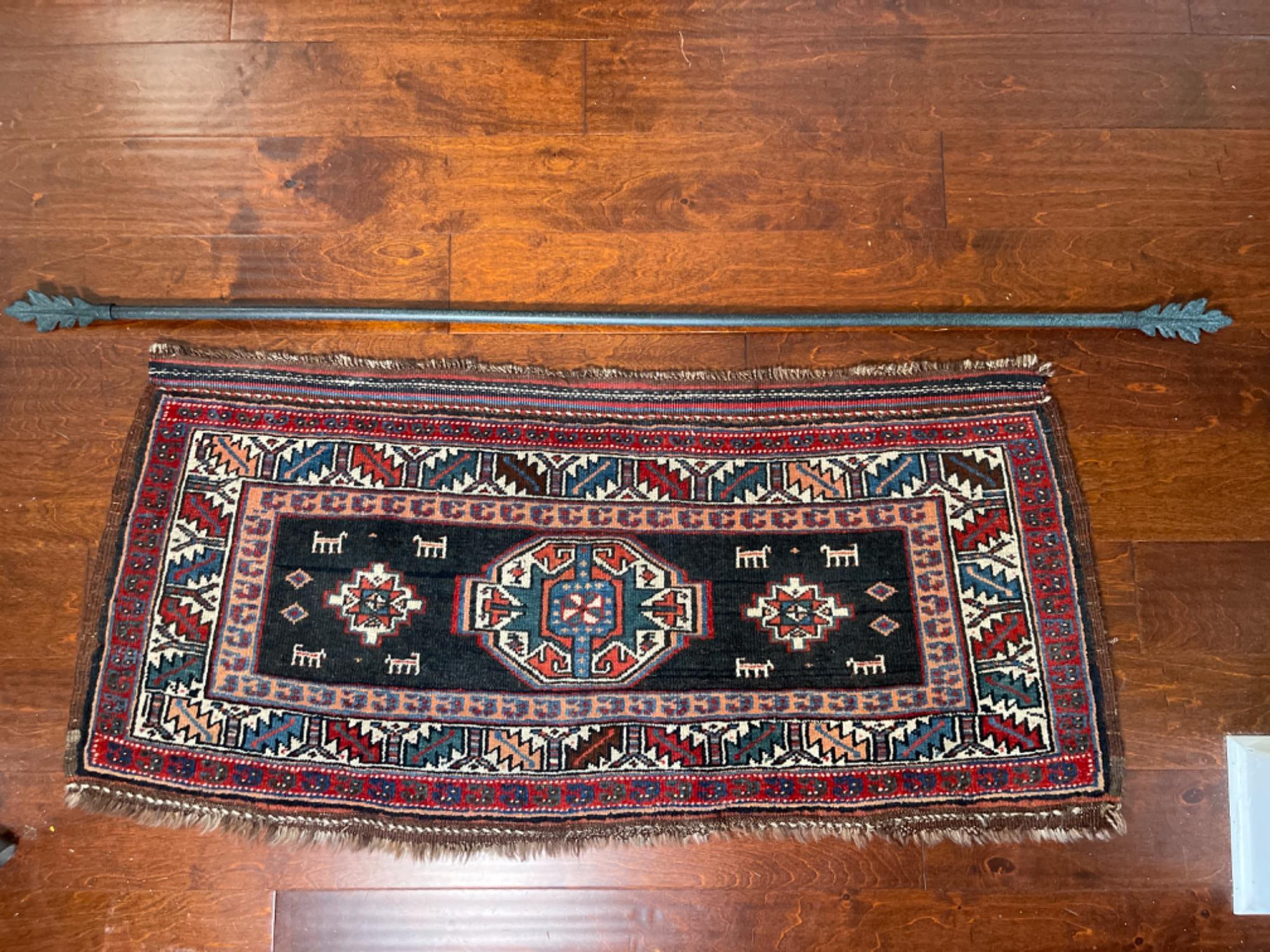 Antique Persian Veramin Bag Face With Wall Hanging Hardware. This antique Qashqai rug from late 19th century Persian features a medallion in its central field, which is surrounded by latch hooks. Geometric designs fill the surrounding central field and border. Colors include red, olive, ivory, and onyx. Antique Persian, extremely finely woven antique Qashqai Bag Face in Brilliant colors with Latch Hook Medallion / type: Iran / Qashqai, circa 1870.