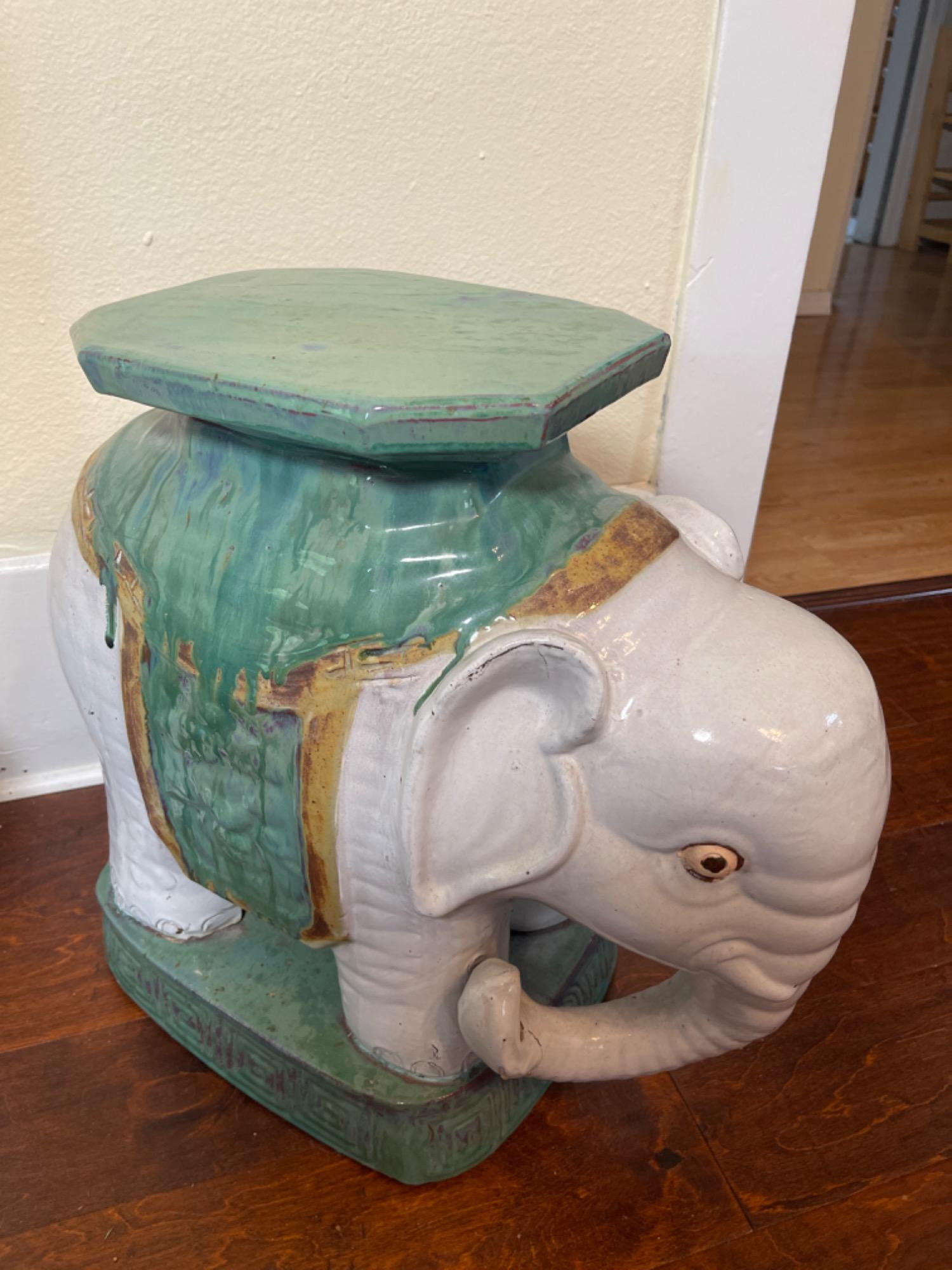 Vintage Glazed Ceramic Elephant Stand/Seat. Please see photos, a crack on the elephant trunk
