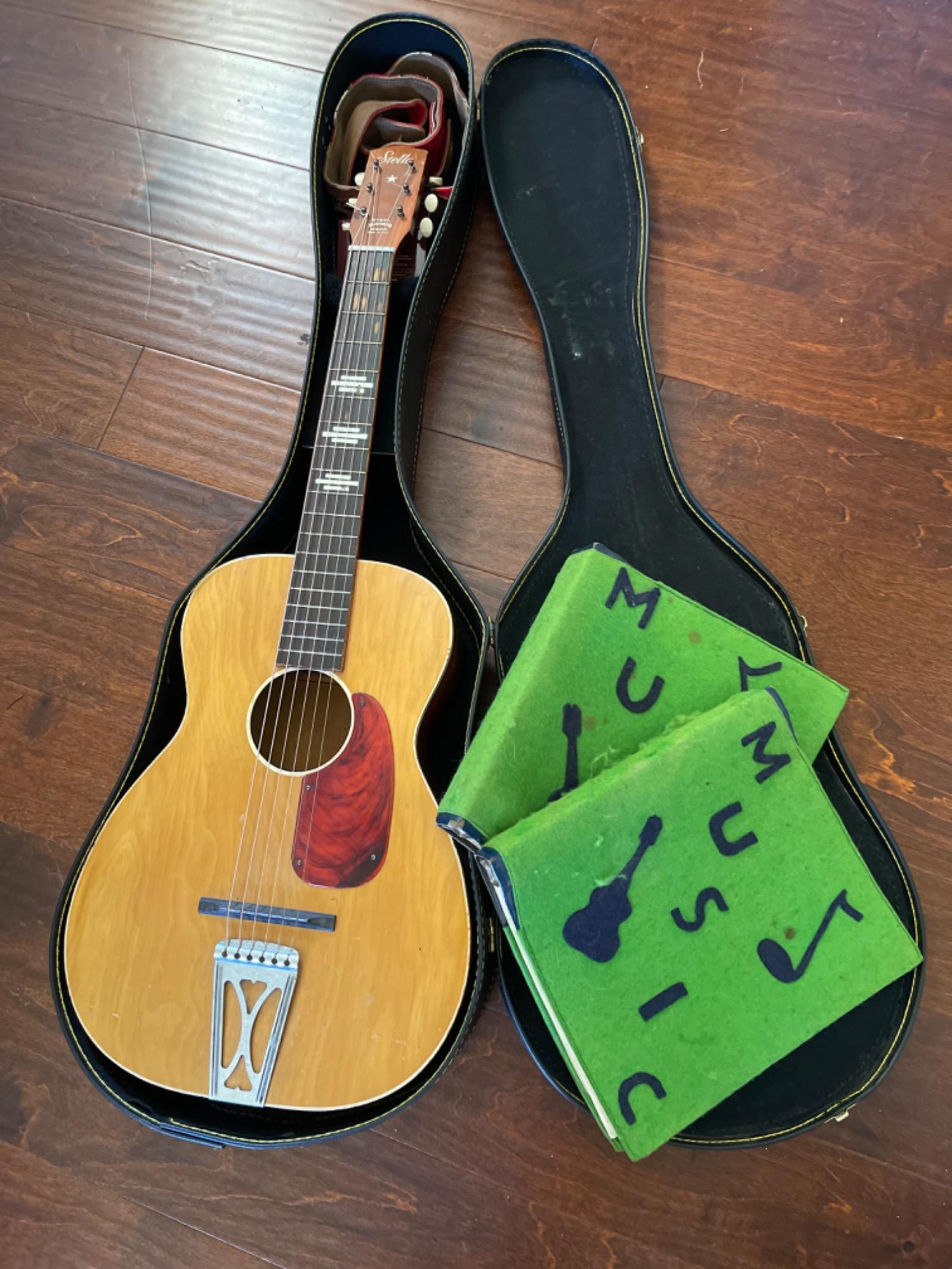 Stella Acoustic Guitar With Case and Music Books. Steel reinforced neck. Shoulder strap, hand made music books with an assorted genre. 2 pack capos included. Well maintained, may need tuning.