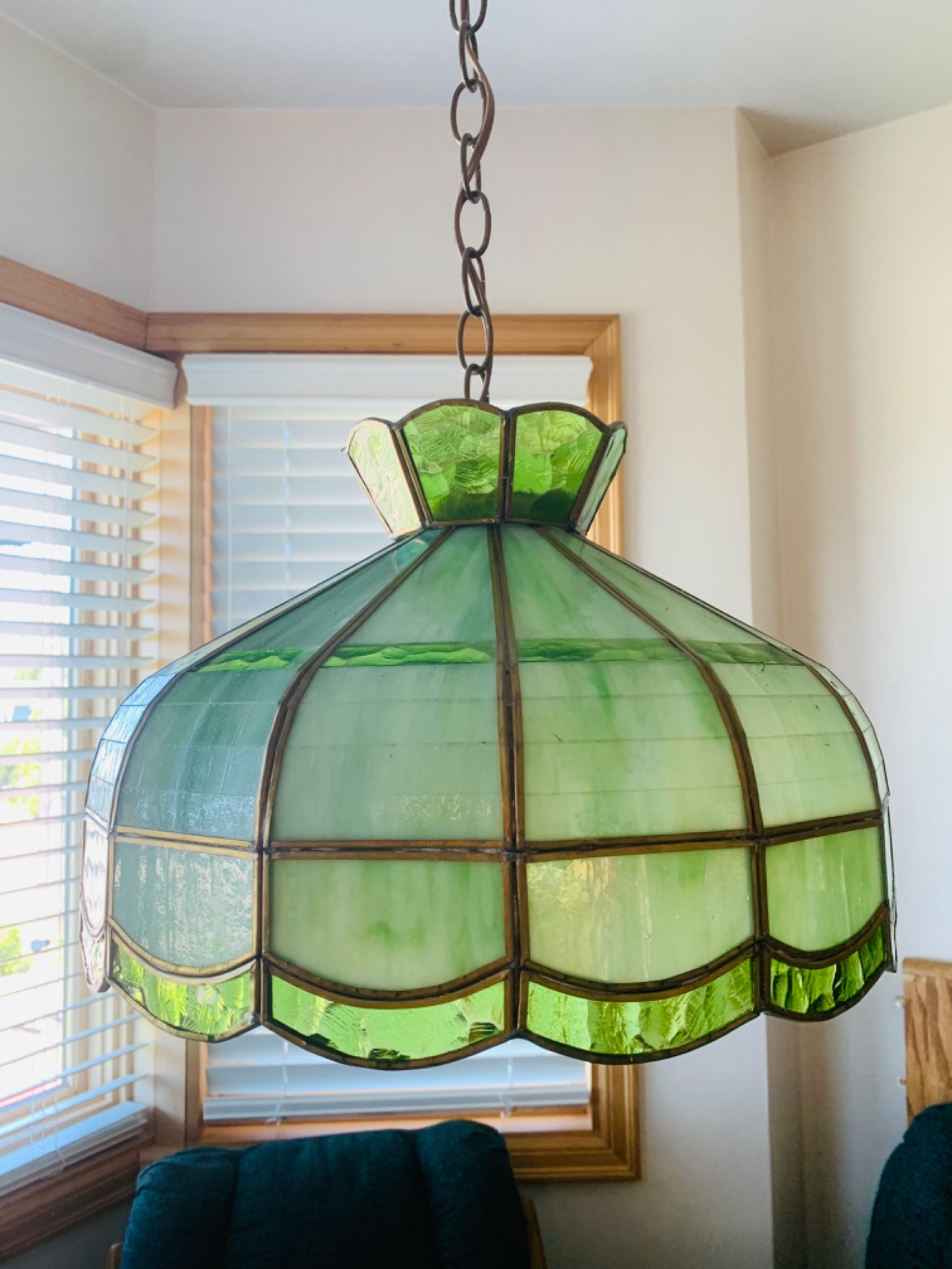 Vintage 1960s Stained Glass Swag Light-Tacoma Narrows Drive Pick Up. Chain is approximately 33 in long. Beautiful color and detail. Bring tools to dismantle. In great condition.