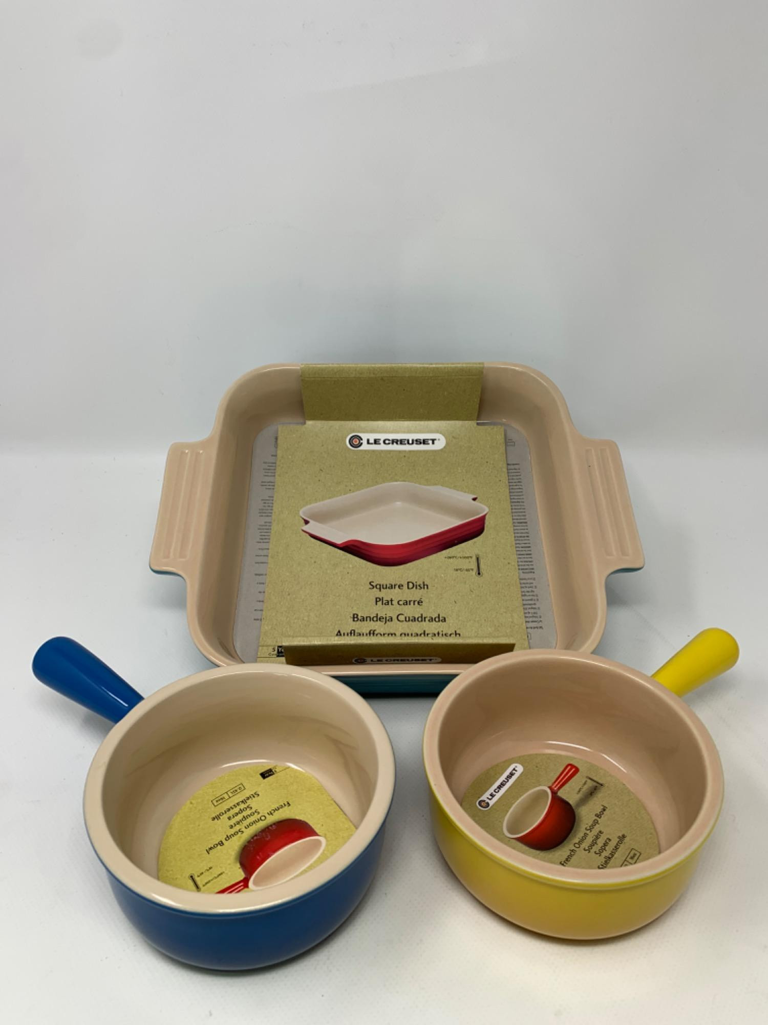 New baking dishes by Le Creuset. Square 9inch and two French onion soup bowls.