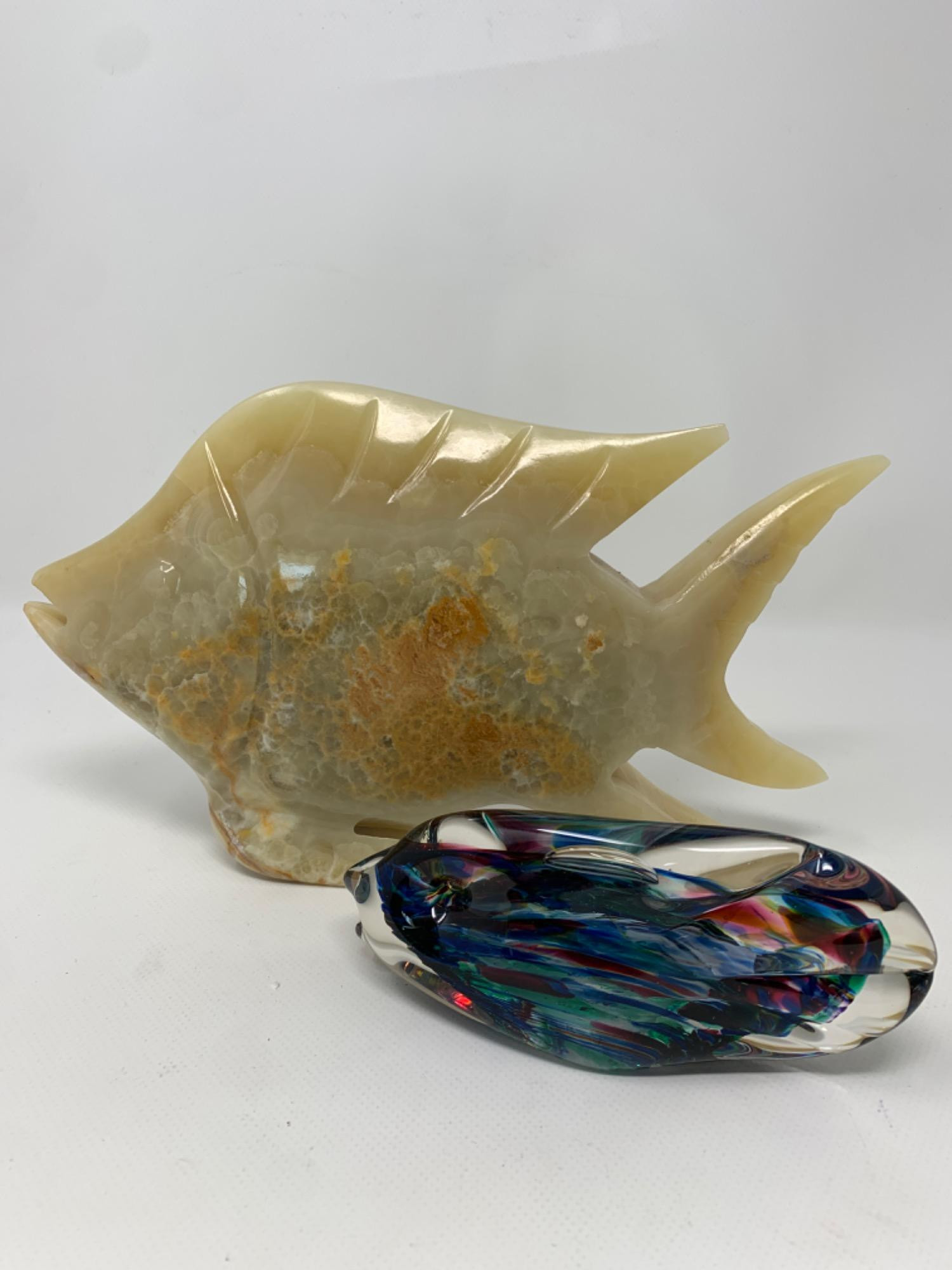 Lot # 56 - Hand Carved Stone Fish And Glass Fish