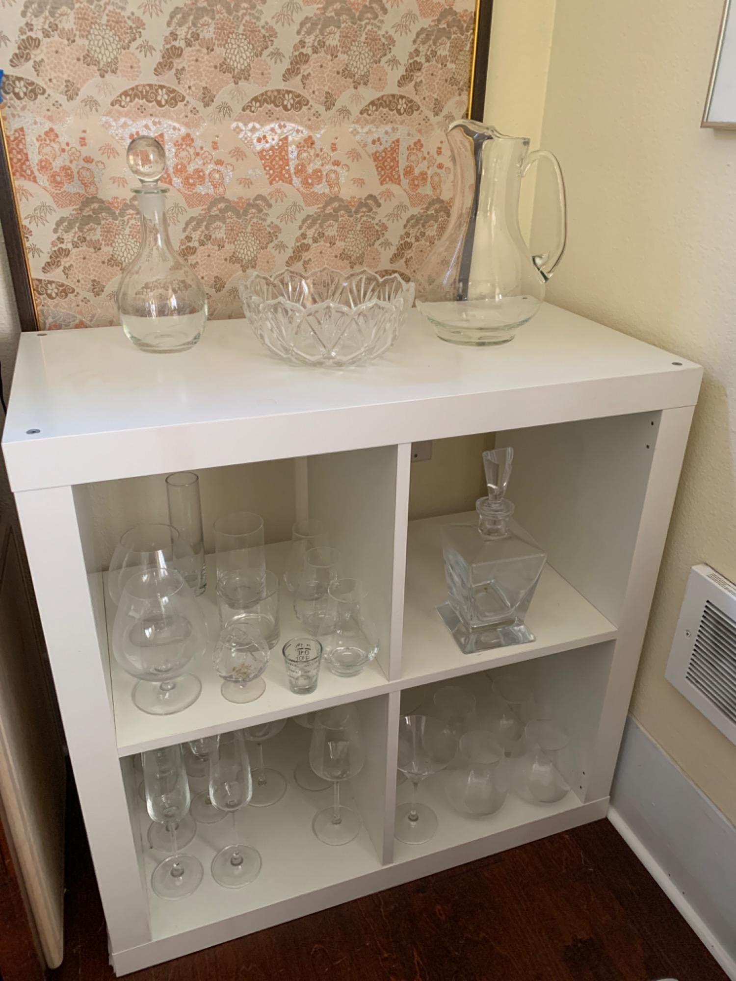 Lot # 90 - White Bookcase with Clear Glass Bar Essentials-Decanters, Stemware