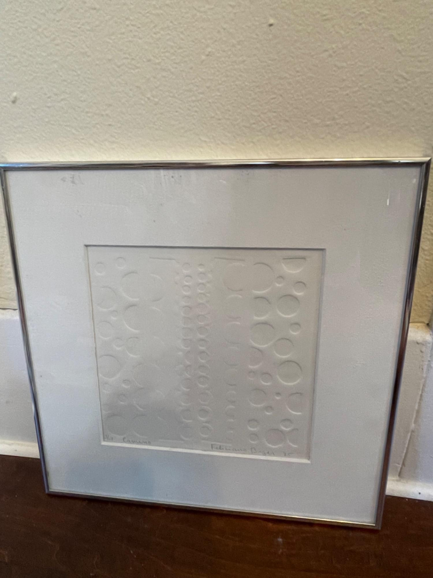 Feliciano Bejar Original Art Relief-Signed and Numbered-3/12 "Carmino" 16 x 16, No COA More about the artist- Feliciano Béjar Ruíz was a Mexican artist and artisan, best known for a style of sculpture called “magiscopios” which involved various materials along with crystals and lenses to play with light or create distorted visions.Béjar was born in rural central Mexico and was completely self-taught as an artist. He was creative as a young child, drawing and creating his first sculpture like pieces from papier-mâché. His art career began in New York, where he had travelled and lived for a time in Hell’s Kitchen.Béjar drew the attention of Arthur Ewart and Frances Coleman, with the latter helping him have his first exhibition and whose husband helped sponsor his time in Europe. The magiscopes arose from an intense interest in light and the sun, which began when he saw a boy in Italy playing with reflections of the sun in puddles. Images of the sun appeared in his painting and sculpture, developing into the use of crystals and lenses.In his later life, Béjar withdrew from the art world for about sixteen years, disillusioned with it and retreating to his ranch in the State of Mexico. He returned in 1998, with a retrospective of his work in Mexico City and continued to show his work until shortly before his death.