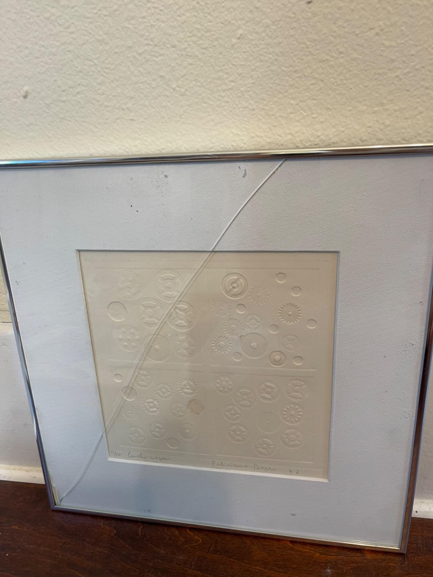 Feliciano Bejar Original Art Relief-Signed and Numbered 6/10. No COA Glass is broken on outside of frame, Does not affect the artwork. More about the artist- Feliciano Béjar Ruíz was a Mexican artist and artisan, best known for a style of sculpture called “magiscopios” which involved various materials along with crystals and lenses to play with light or create distorted visions.Béjar was born in rural central Mexico and was completely self-taught as an artist. He was creative as a young child, drawing and creating his first sculpture like pieces from papier-mâché. His art career began in New York, where he had travelled and lived for a time in Hell’s Kitchen.Béjar drew the attention of Arthur Ewart and Frances Coleman, with the latter helping him have his first exhibition and whose husband helped sponsor his time in Europe. The magiscopes arose from an intense interest in light and the sun, which began when he saw a boy in Italy playing with reflections of the sun in puddles. Images of the sun appeared in his painting and sculpture, developing into the use of crystals and lenses.In his later life, Béjar withdrew from the art world for about sixteen years, disillusioned with it and retreating to his ranch in the State of Mexico. He returned in 1998, with a retrospective of his work in Mexico City and continued to show his work until shortly before his death.