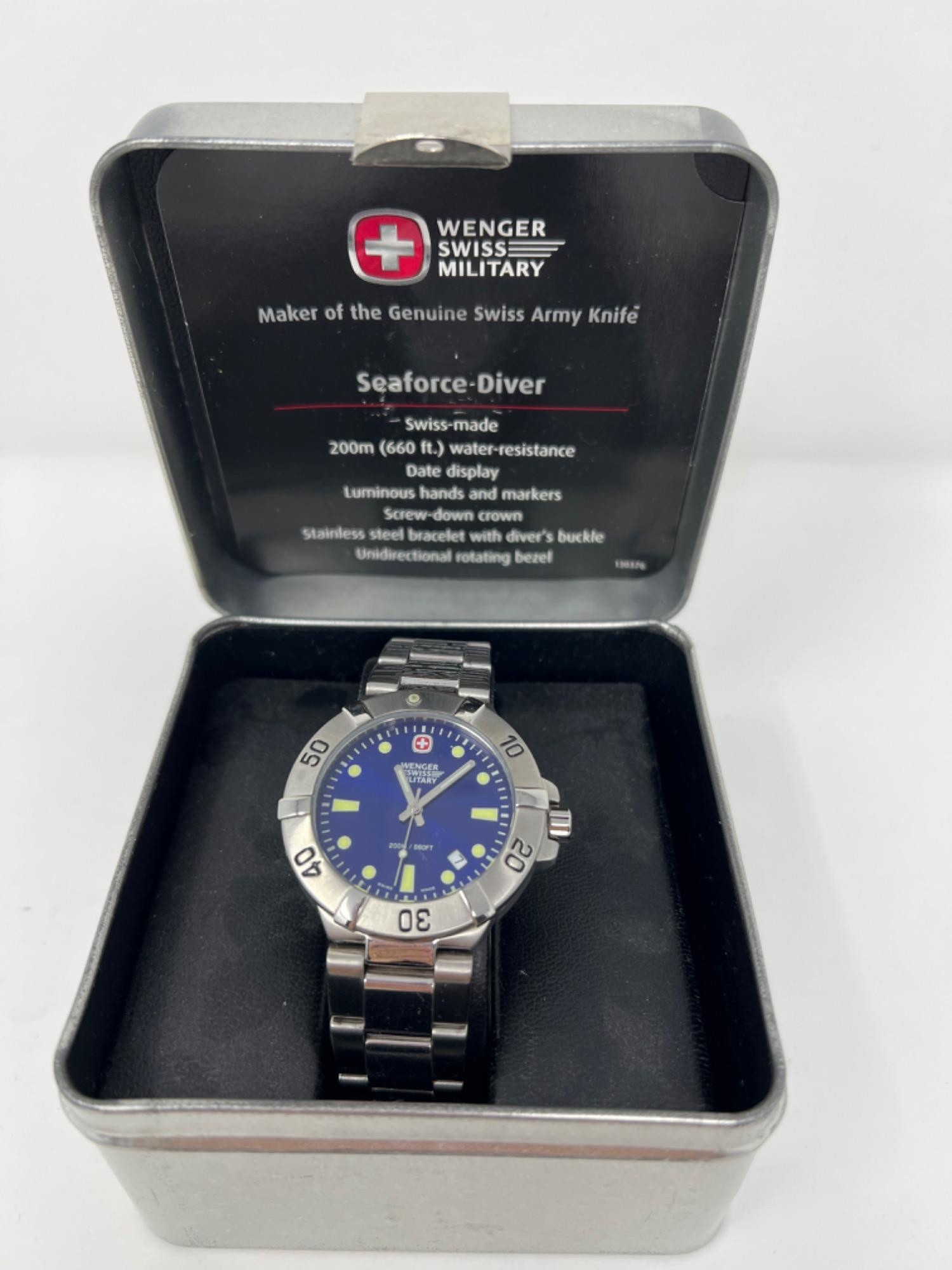 Wenger 79178 Swiss Military watch has dive watch features a solid stainless steel case with a fixed bezel. Swiss quartz movement, blue dial with green accents and silver tone luminous hands and hour markers. Water resistant to 200 meters. 20mm wide solid stainless steel bracelet with a fold-over deployant safety clasp. Has its original Wenger gift box and instruction booklet. Untested. Currently not ticking, and may need servicing.