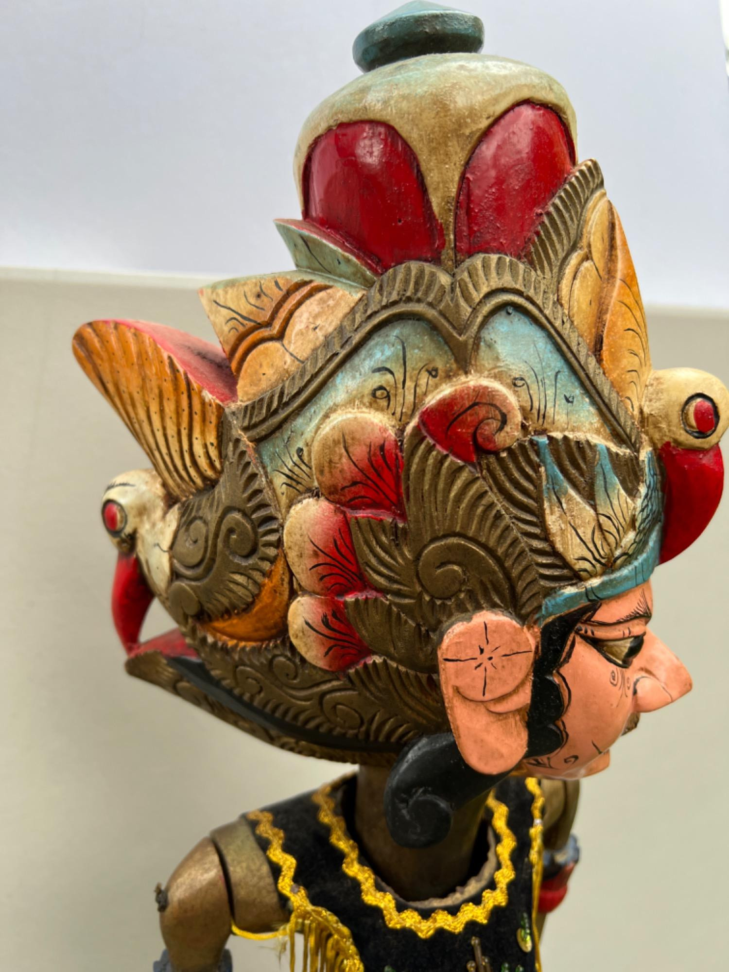 Indonesian Wayang Golek Hand Carved & Painted Wooden Rod Puppet #3. This is a hand carved wood puppet with bamboo rods that is creatively hand painted in Indonesian cultural style. Probably early 20th Century (antique), Java, Indonesia. This puppet is one of 14 varied characters in this auction. This one appears to represent a queen. The puppet has a wooden stand for display and also completely breaks down for transport and/or storage (see Lot 3 for example). Clothing is batik fabric and bodice is made of velveteen fabric and decorated with sequins, beads, and flowing fringe. Arms are jointed. This is not a small puppet. It stands nearly 3 feet tall. Puppeteer would hold stick under long fabric skirt to move head from side-to-side and use bamboo rods to move arms. As is condition. May have imperfections due to age or how the puppet was crafted.