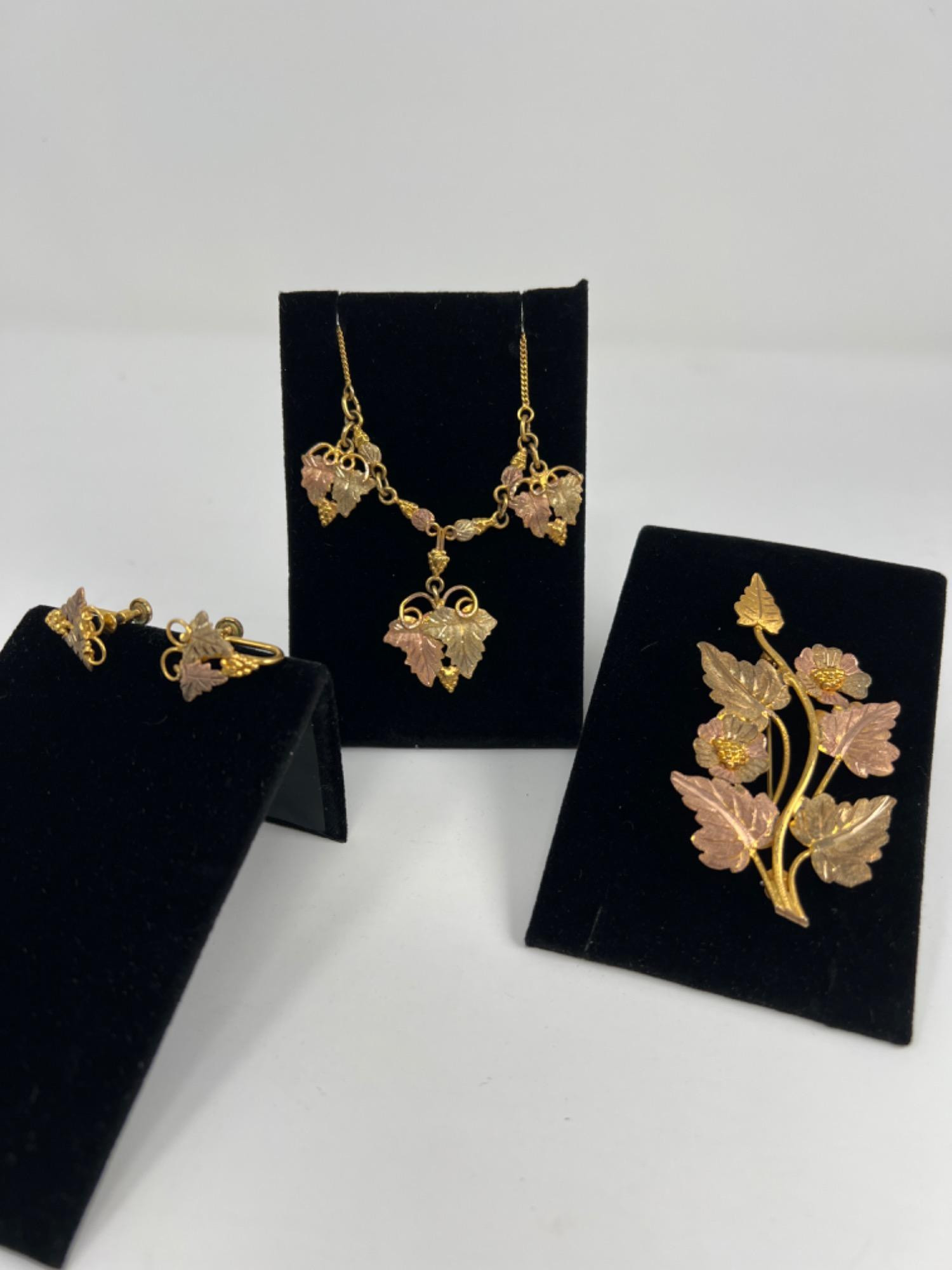 15” necklace with 3 leaves and vine and grape cluster design. Appears to be marked 10k or 12k. Earrings are screw backs marked 12k gold filled on screw, and 12K on leaf. Floral & leaf 3” x 2” brooch is marked 12k.