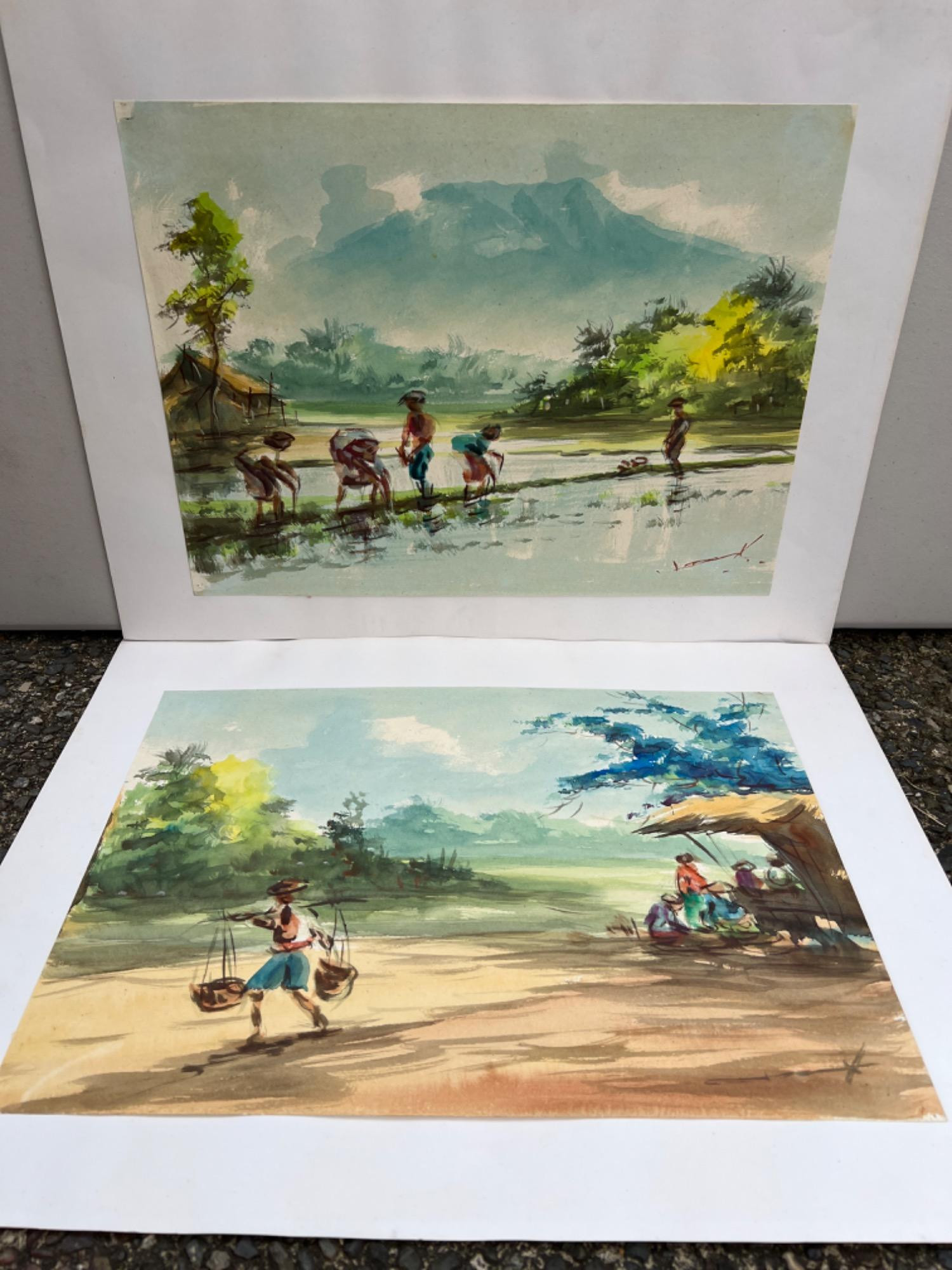 Two original watercolor paintings on art paper and mounted on a plain paper backing stamped "Sabanda Sariksa Sabari. Paintings depict village life in Asia.