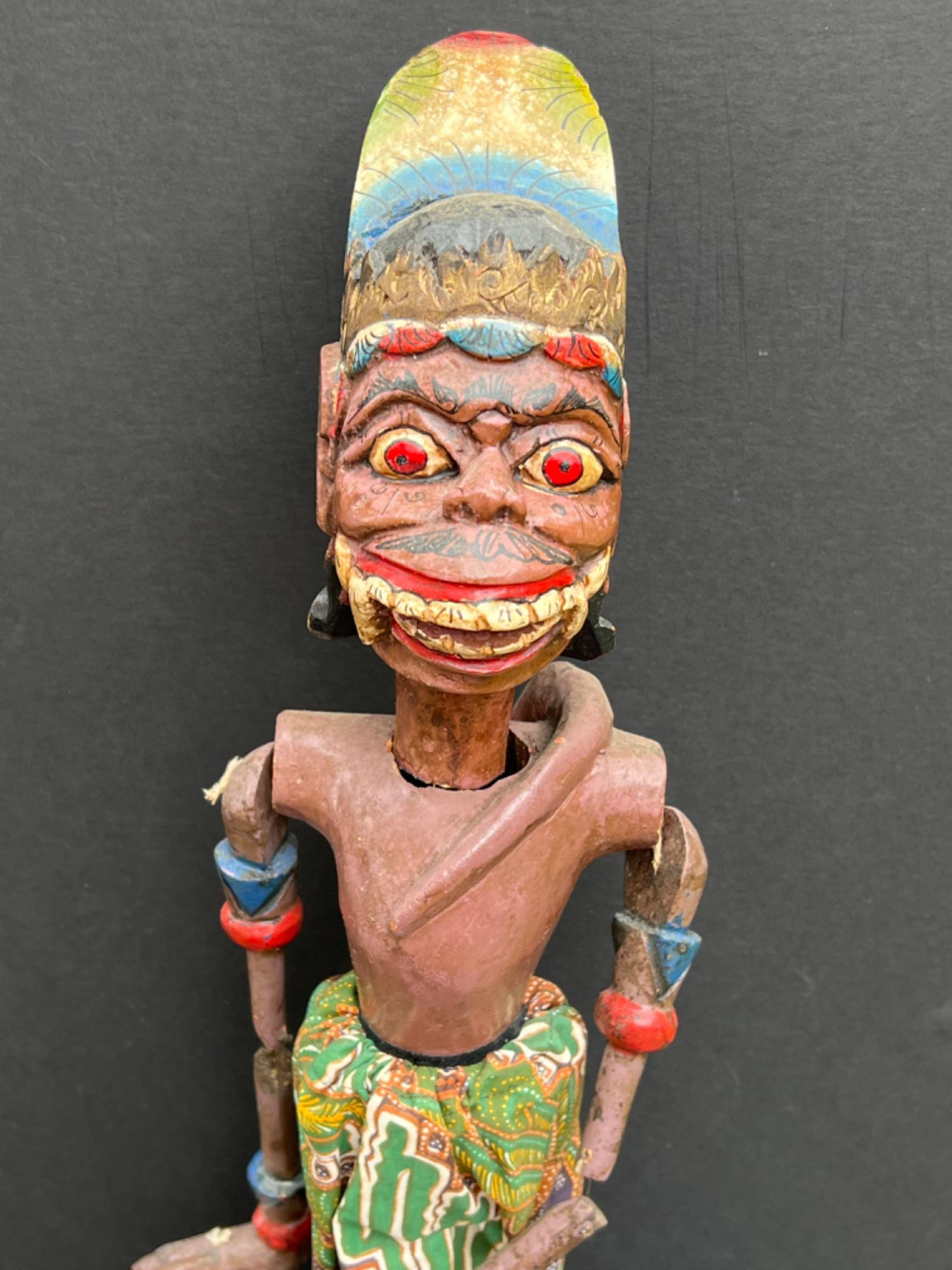 Indonesian Wayang Golek Hand Carved & Painted Wooden Rod Puppet #4 - potentially antagonist character or possibly witch doctor. Hand carved wood puppet with bamboo rods that is creatively hand painted in Indonesian cultural style. Probably early 20th Century (antique), Java, Indonesia. This puppet is one of 14 varied characters in this auction. The puppet has a wooden stand for display and also completely breaks down for transport and/or storage (see Lot 3 for example). Clothing is batik fabric. Arms are jointed. This is not a small puppet. It stands over 2 feet tall. Puppeteer would hold stick under long fabric skirt to move head from side-to-side and use bamboo rods to move arms. As is condition. May have imperfections due to age or how the puppet was crafted.