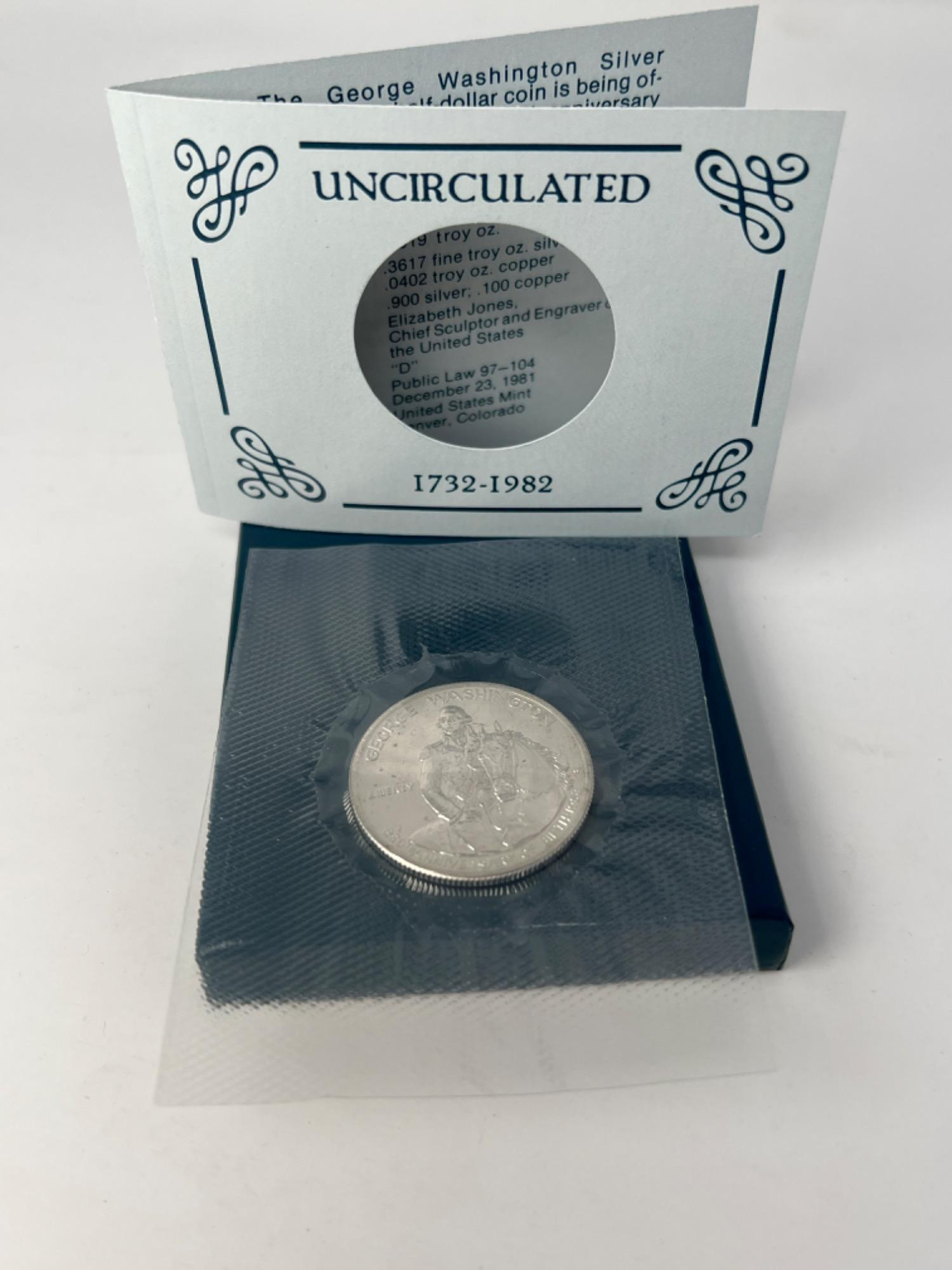 Uncirculated silver commemorative half-dollar coin recognizing the 250th anniversary of the birth of George Washington (1732-1982). Comes in original packaging and case.