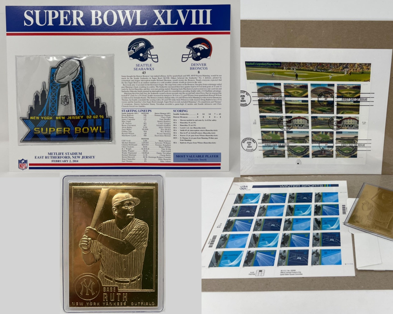 Super Bowl XLVIII sewn-on patch Seattle Seahawks vs. Denver NFL football collectible. 20 First Day of Issue legendary baseball fields (USA .34 cent) stamps - includes Tiger Stadium, Detroit; Yankee Stadium, New York; Shibe Park, Philadephia; Fenway Park, Boston; Wrigley Field, Chicago -- and more (sealed package). 20 USA Oympics Winter Sports .34 cent postage stamps in sealed package. Product of the United States Olympic Committee. Sealed package. 1996 Danbury Mint Babe Ruth New York Yankees gold trading card in sealed plastic holder.