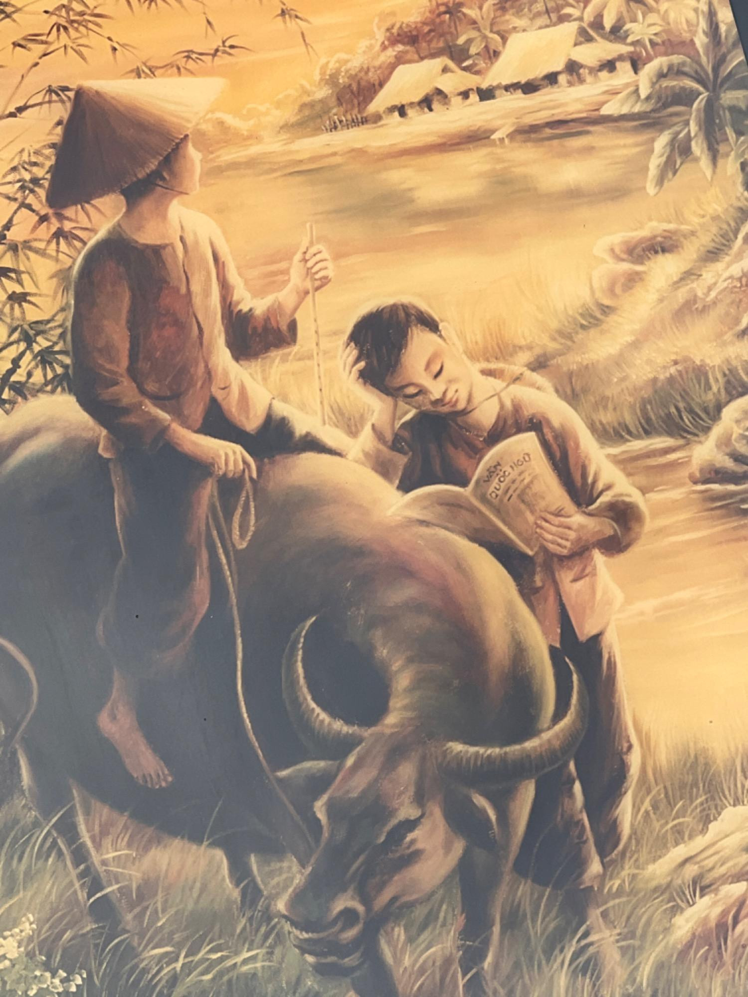 Laquered on black board rural scene in Vietnam and signed by artist. 1986
