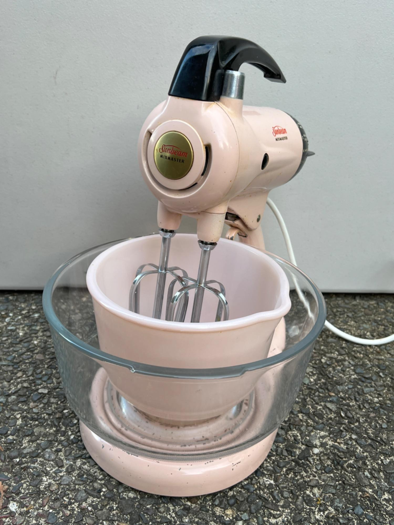 Vintage Mid Century (Circa 1950’s) pink Sunbeam Mixmaster various speeds and slow/high setting. Works. Includes two bowls - clear glass and pink with pourer spout. As found. Item is NOT eligible for shipping.