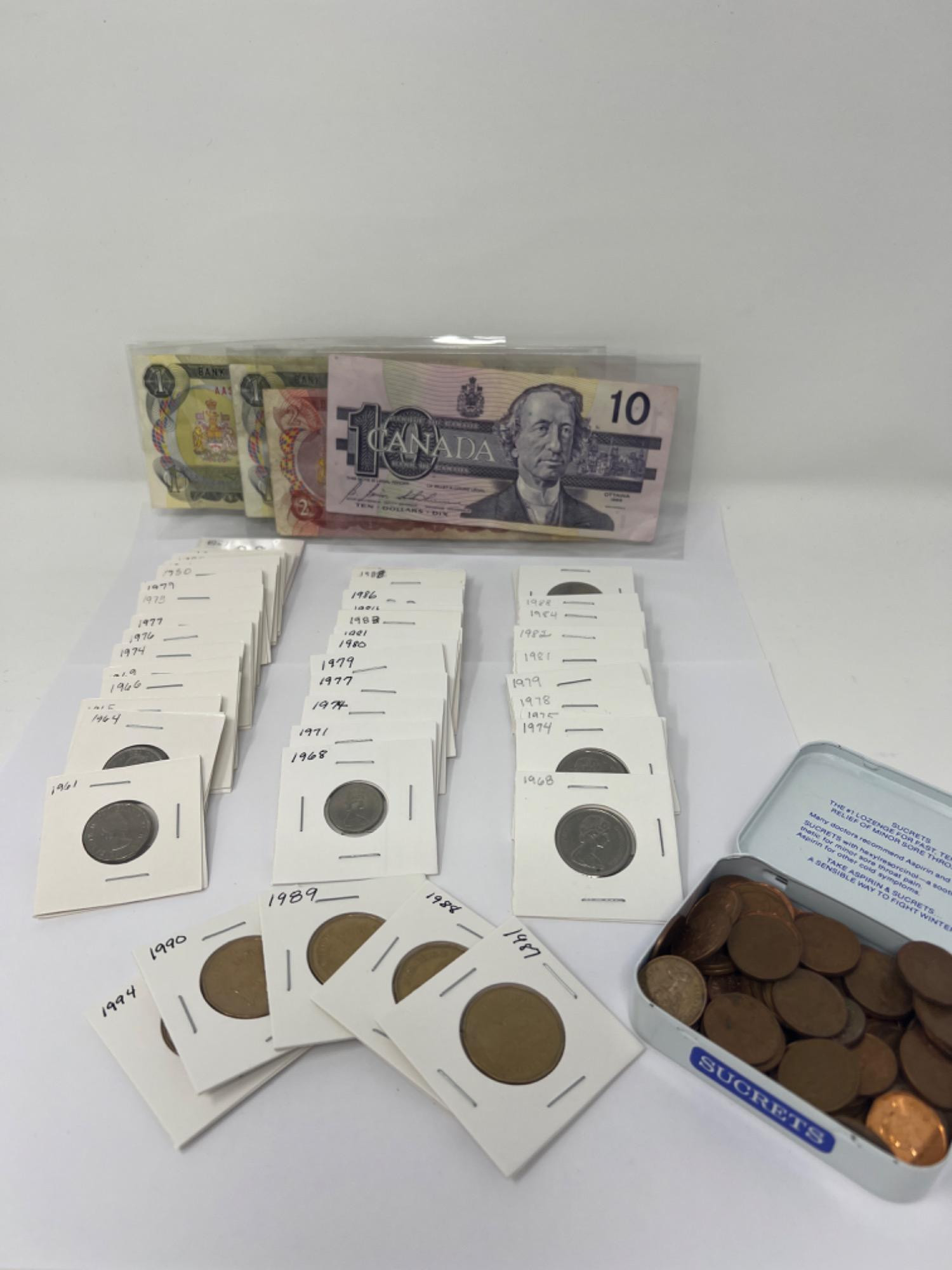 Variety of pennies, nickels, dimes, quarters, dollar coins, and paper dollars of Canadian mint in collector flip holders. Nickels range from 1961 to 1981 (random years) Dimes range from 1968 to 1989 (random years) Quarters range from 1968 to 1993 (rabdom years) Dollar coins - 1987, 1988, 1989, 1990, 1994 Pennies in Sucrets tin - uncounted Ten dollar, two dollar and 2 one dollar bills.