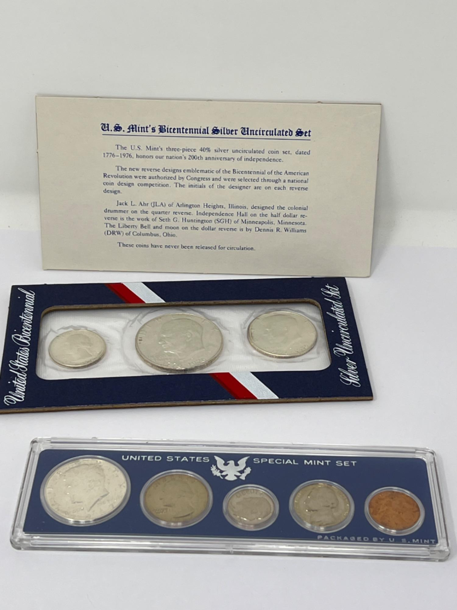 1776-1976 Bicentennial Silver Uncirculated Set includes half dollar, quarter and dollar coins included is the original envelope. 1967 United States Special Mint Set uncirculated. In original package. Quarter, dime, nickel, penny.