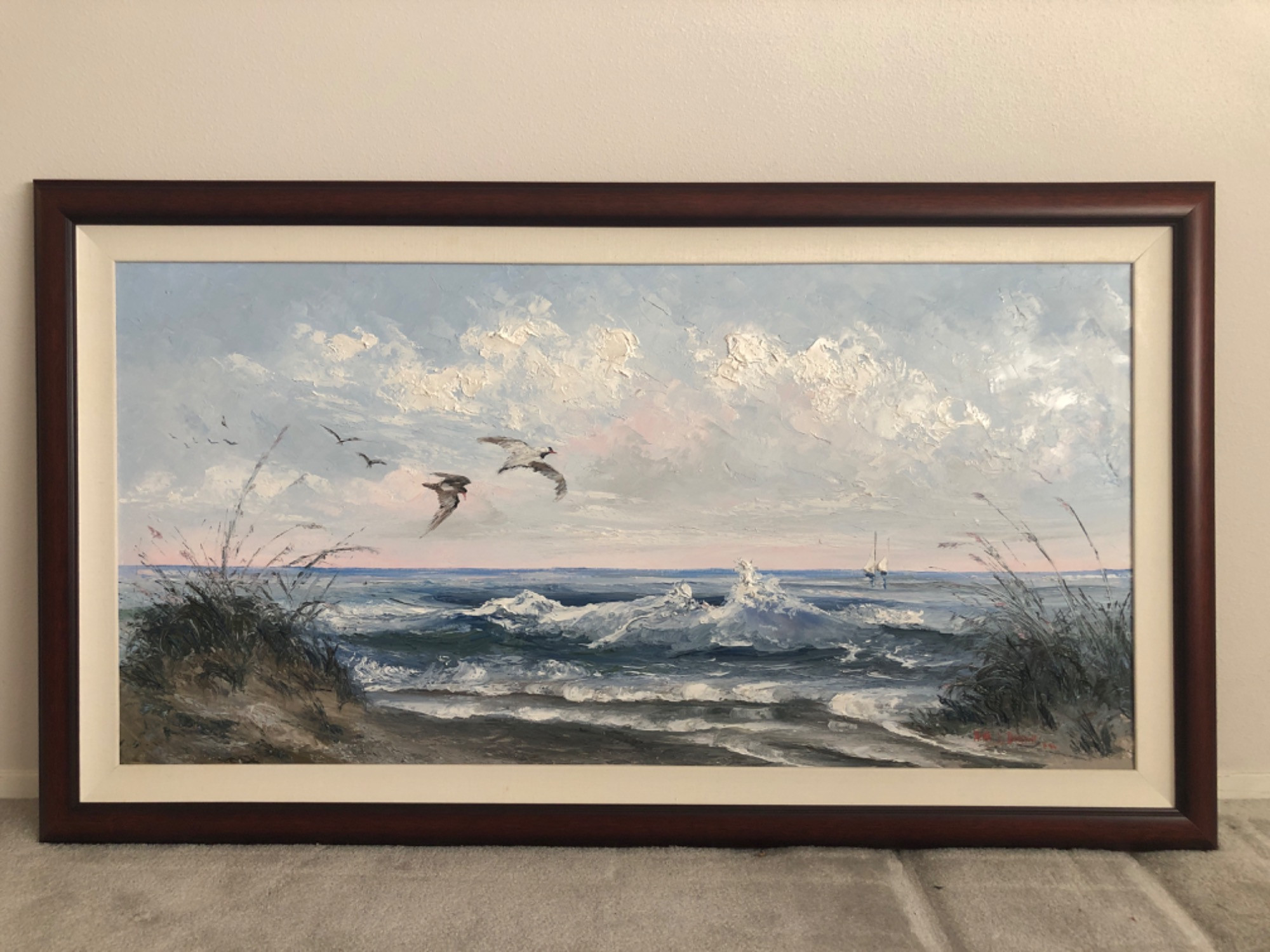 Oil on canvas original seascape painting by Nina D. Buxton, 1994. Seagulls and sailboats on waters with crashing waves. Nina Buxton often visited the NW area to show and sell her paintings.