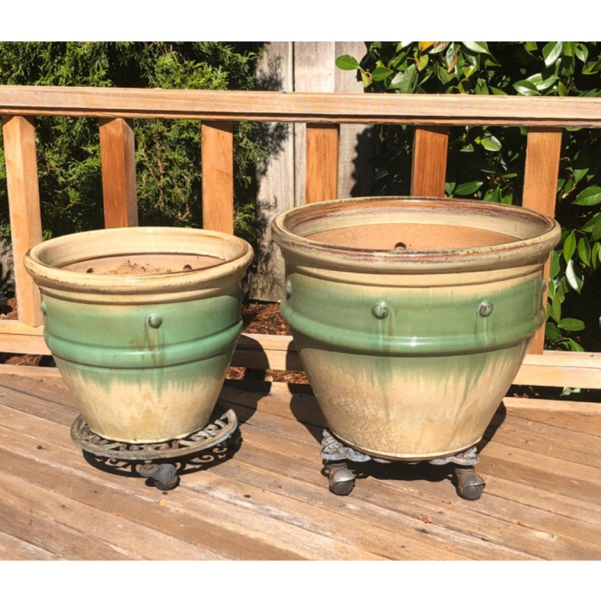 Green and copper colored terracotta garden pots. Includes metal pot stands on rollers. Larger pot is 18" diameter x 15 height and smaller 15" diameter x 12" height.