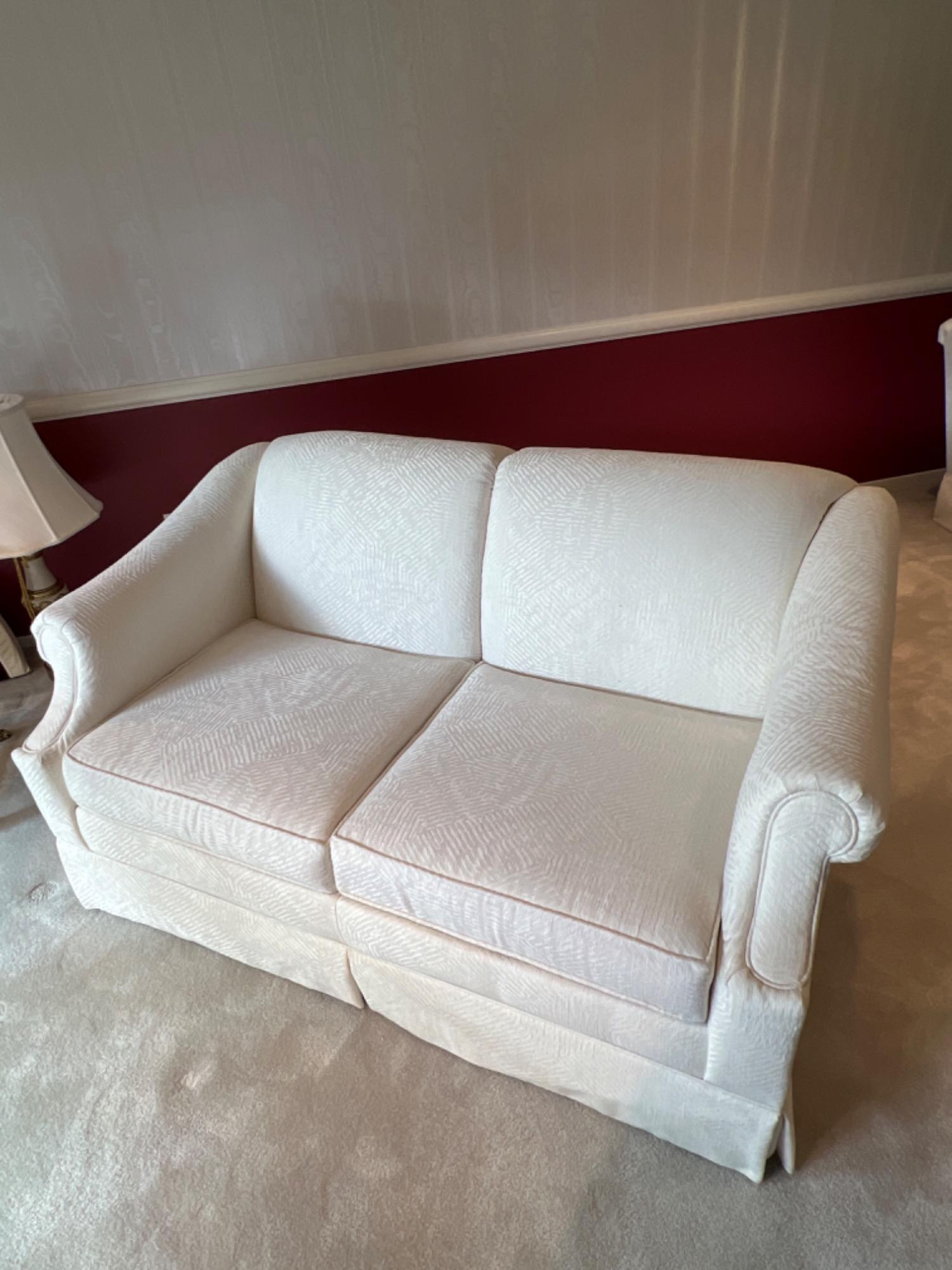 This well-maintained loveseat from the 1990's was purchased from Bel-Red Furniture with a lifetime guarantee. Seat and back cushion covers zip and have few flaws, if any (small spot on one of the back cushions - see pic). Skirted bottom to guard against under couch dust. White designer fabric. Comfortable. Bidding on this lot is an agreement that: (1.) You