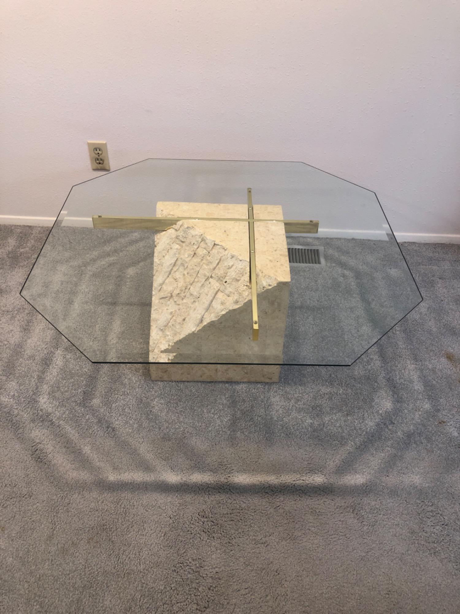 Made in the Philippines by JDI Group. Vintage (circa: 1980's) center table with beveled octagonal glass top, brass cross supports, that sits on top of smooth and rough cut tessellated faux stone base.