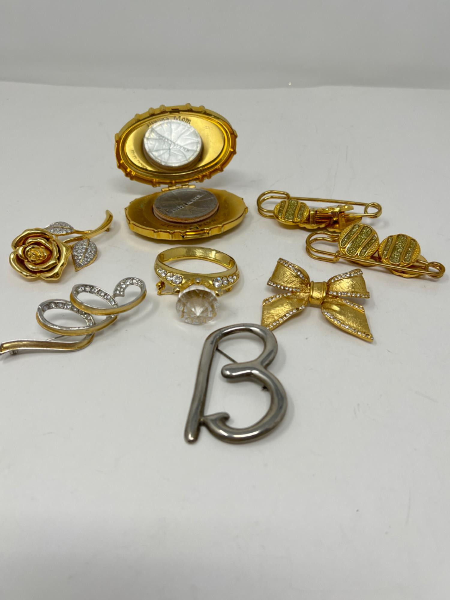 Five brooches approximately 2.5” long Two fashion safety pins with sparkly buttons Estee Lauder Thanks Mom Powder compact (3” long).