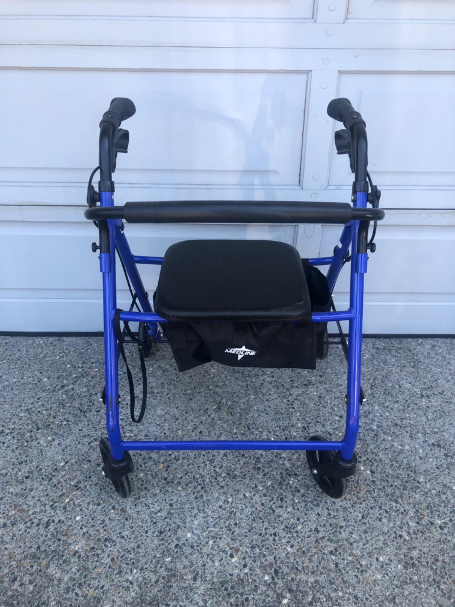 Rolling Collapsible Walker with Seat and Brakes Can be used as either a walker or a seat Easily Collapses Dimensions: Height to handles 32 inches - Ground to top of seat 20 inches - Seat width and depth 12 inches - overall inside width from handle to handle 18 inches