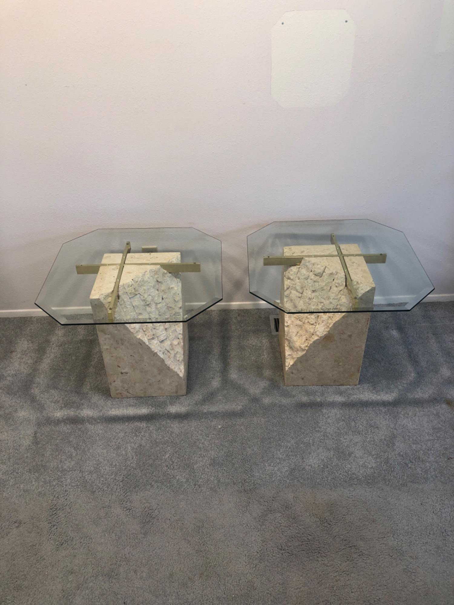 Made in the Philippines by JDI Group. Vintage (circa: 1980's) end tables with beveled octagonal glass top, brass cross supports, that sits on top of smooth and rough cut tessellated faux stone base. 1stDibs retails this set at $795.