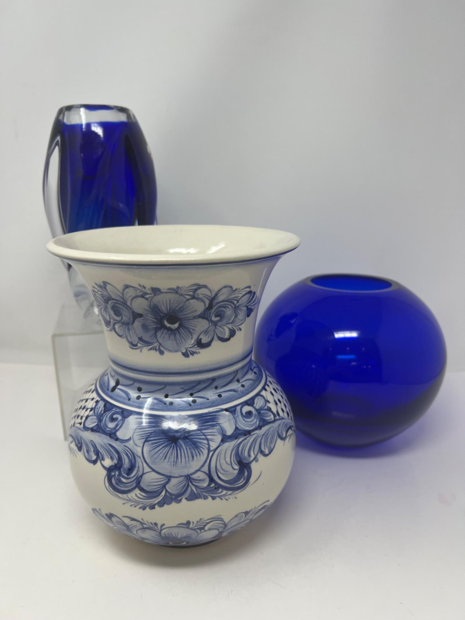 Porcelain vase is 8” tall by 6” wide at mouth of vase. 7.5” x 4” wide swirl glass clear and blue vase. 6” x 6” covalt blue round with 2.75” opening vase.