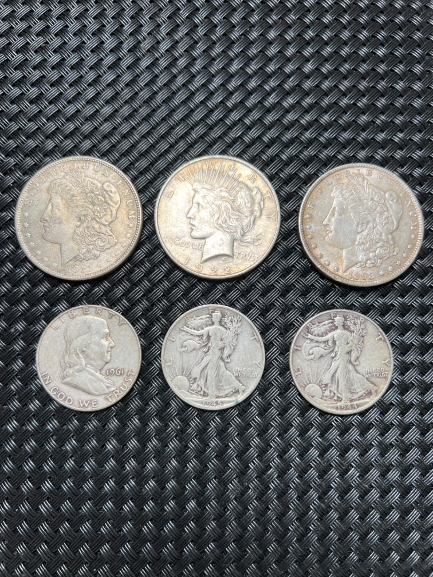 Two Morgan Half Dollars, One Peace Dollar, Two Walking Liberty half dollars, and Franklin half dollar.