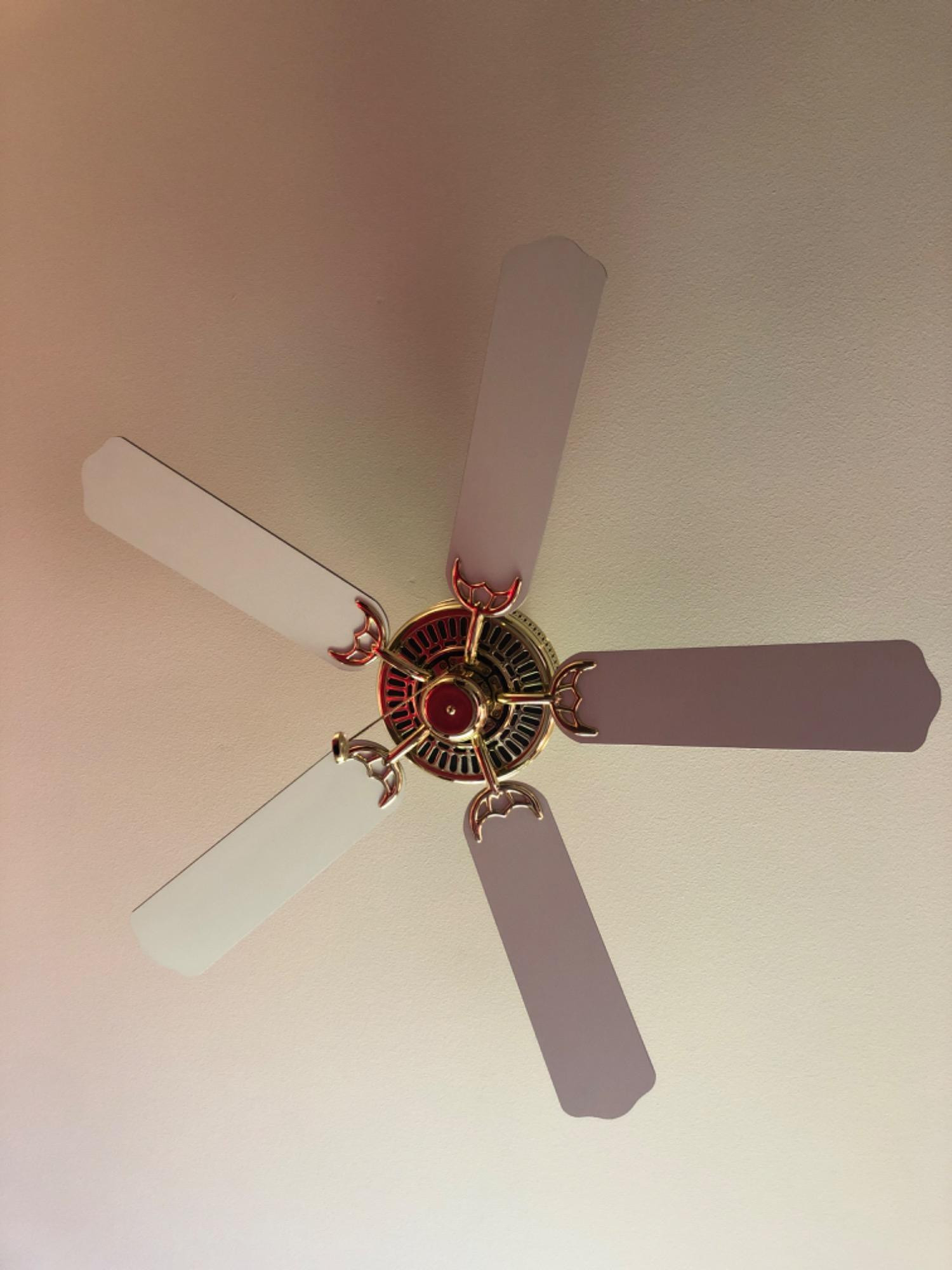 5 Blade Ceiling Fan Dimensions: Hangs down 11 inches - Outside blade to outside blade 50 inches Ceiling fan is installed in the ceiling and will have to be removed by the winning bidder If bidding on this item, you agree to bring the proper tools to remove the item from the ceiling