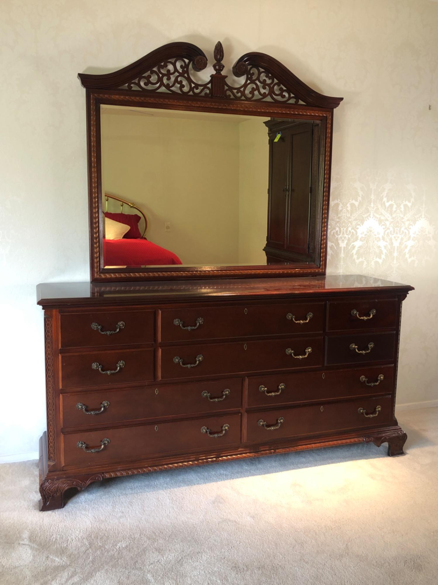 Stoneleigh Mahogany Dresser with Mirror 12 Drawers Dresser Dimensions: 34 Inches high x 67 inches wide x 18 inches deep Mirror Dimensions:44 inches high x 48 inches wide x 1.5 inches deep Bidding on this lot is an agreement that: (1.) You