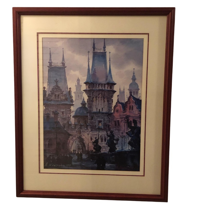 Collotype of Anatole Krasnyansky's painting 'Prague, Bridge of King Karl.' It is signed in ink by the artist, professionally framed, triple matted, and under glass.