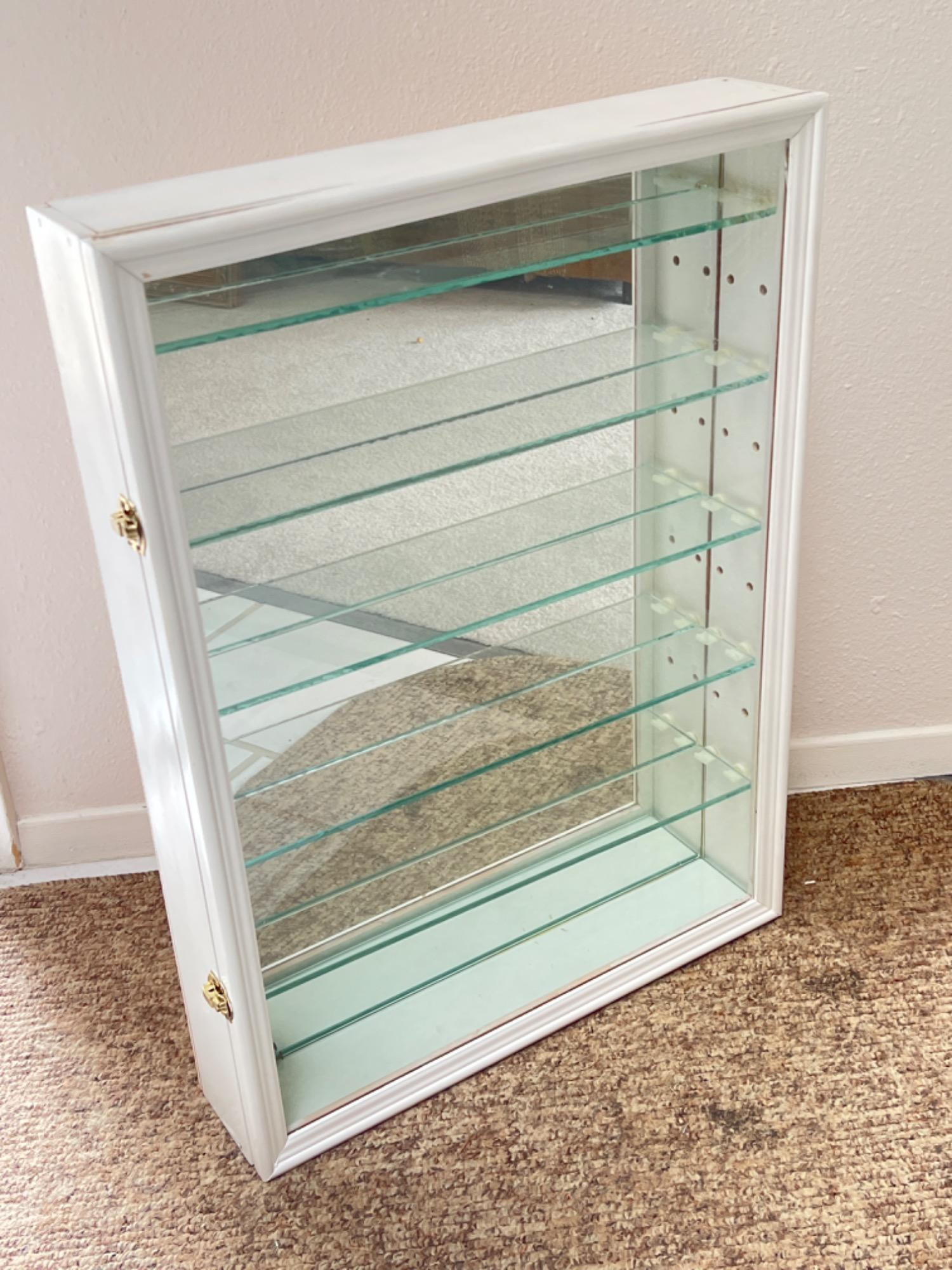 Perfect for storing Swarovski Figures or other collectibles. Hangs on wall. Hinged door with clasp.