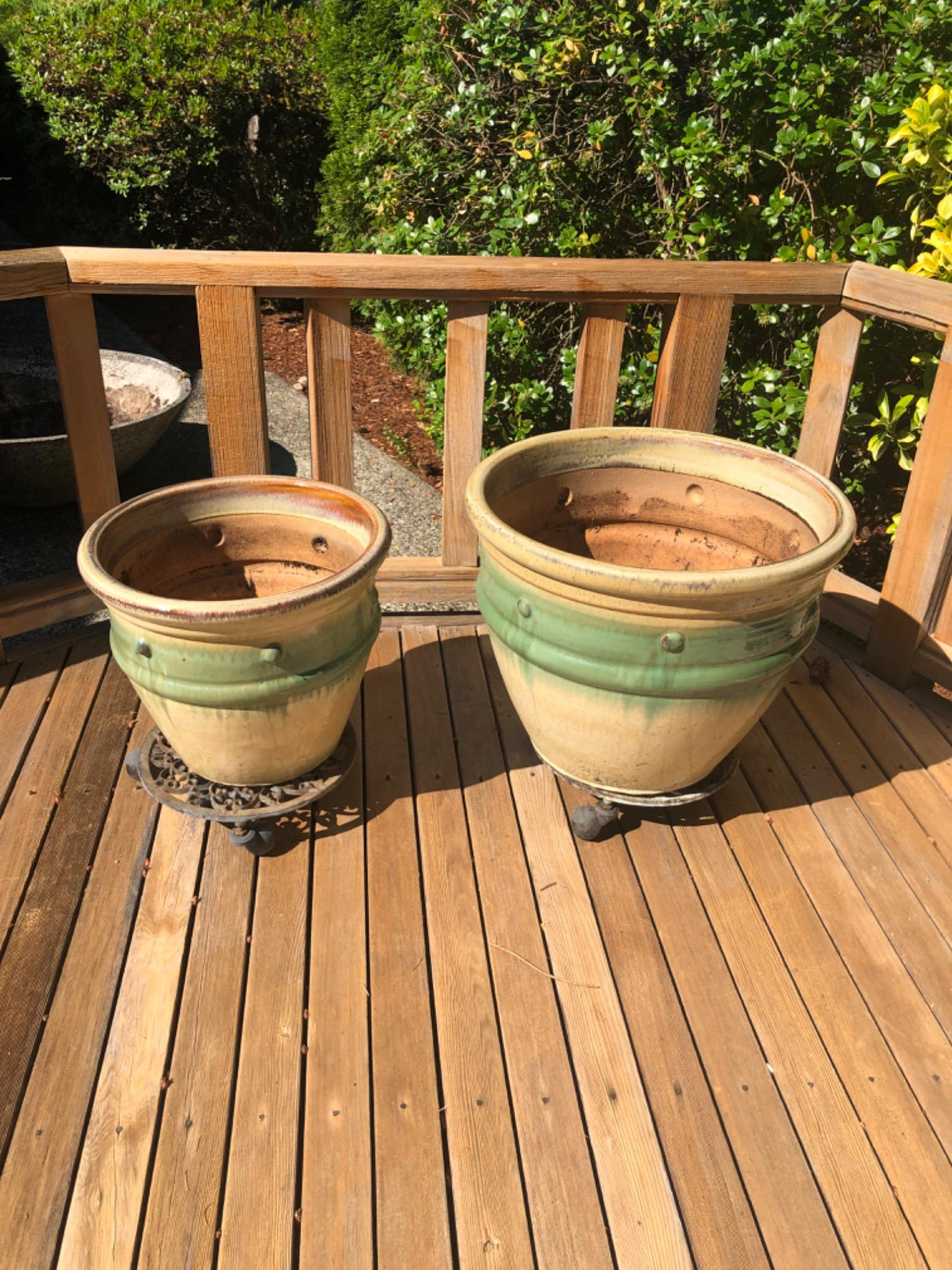 Green and copper colored terracotta garden pots. Includes metal pot stands on rollers. Larger pot is 18" diameter x 15 height and smaller 15" diameter x 12" height.