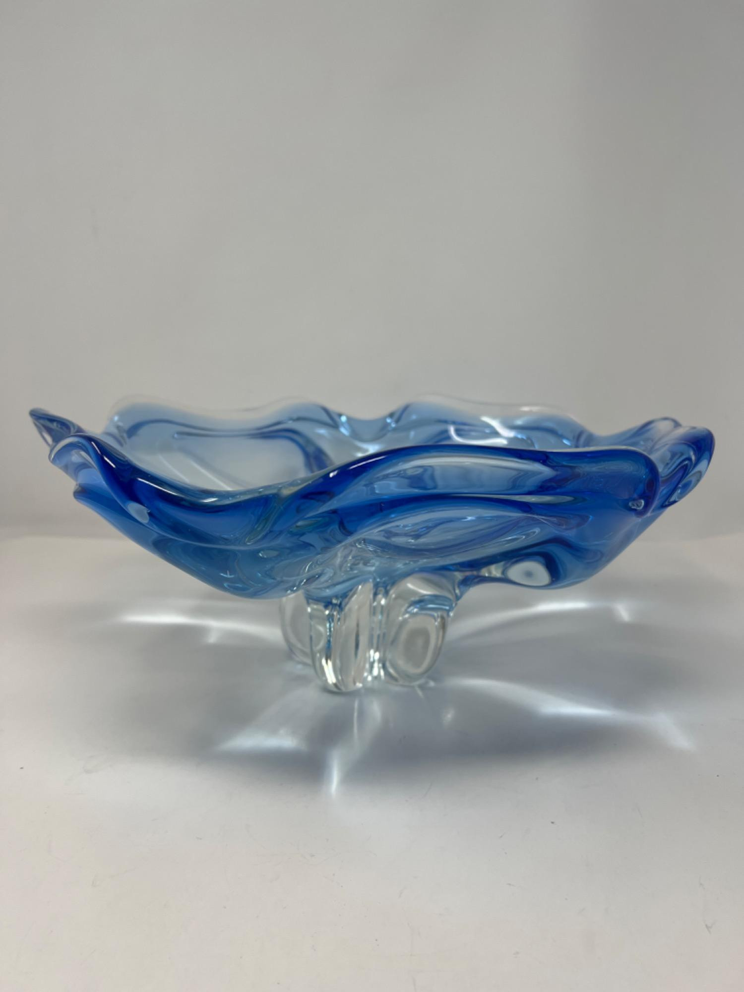 This captive blue to transparent center bowl is in the Murano? styling. Glass bowl has weight. There are no marks or certifications. Size: 14” round x 5.25” tall