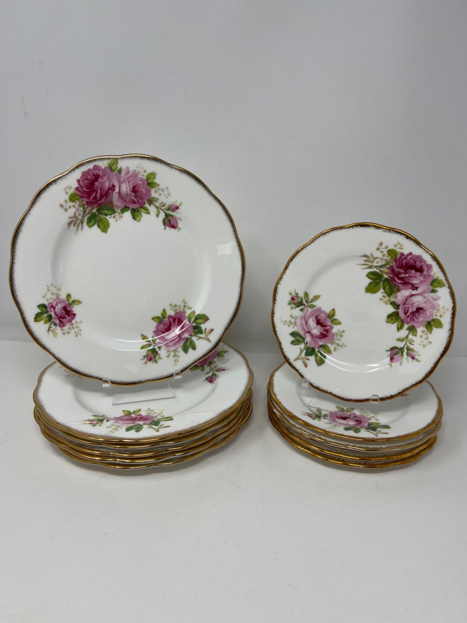 American Beauty stamped salad and bread/dessert plates - 6 of each. Royal Albert Bone China England. 8” salad plates 6” bread/dessert plates