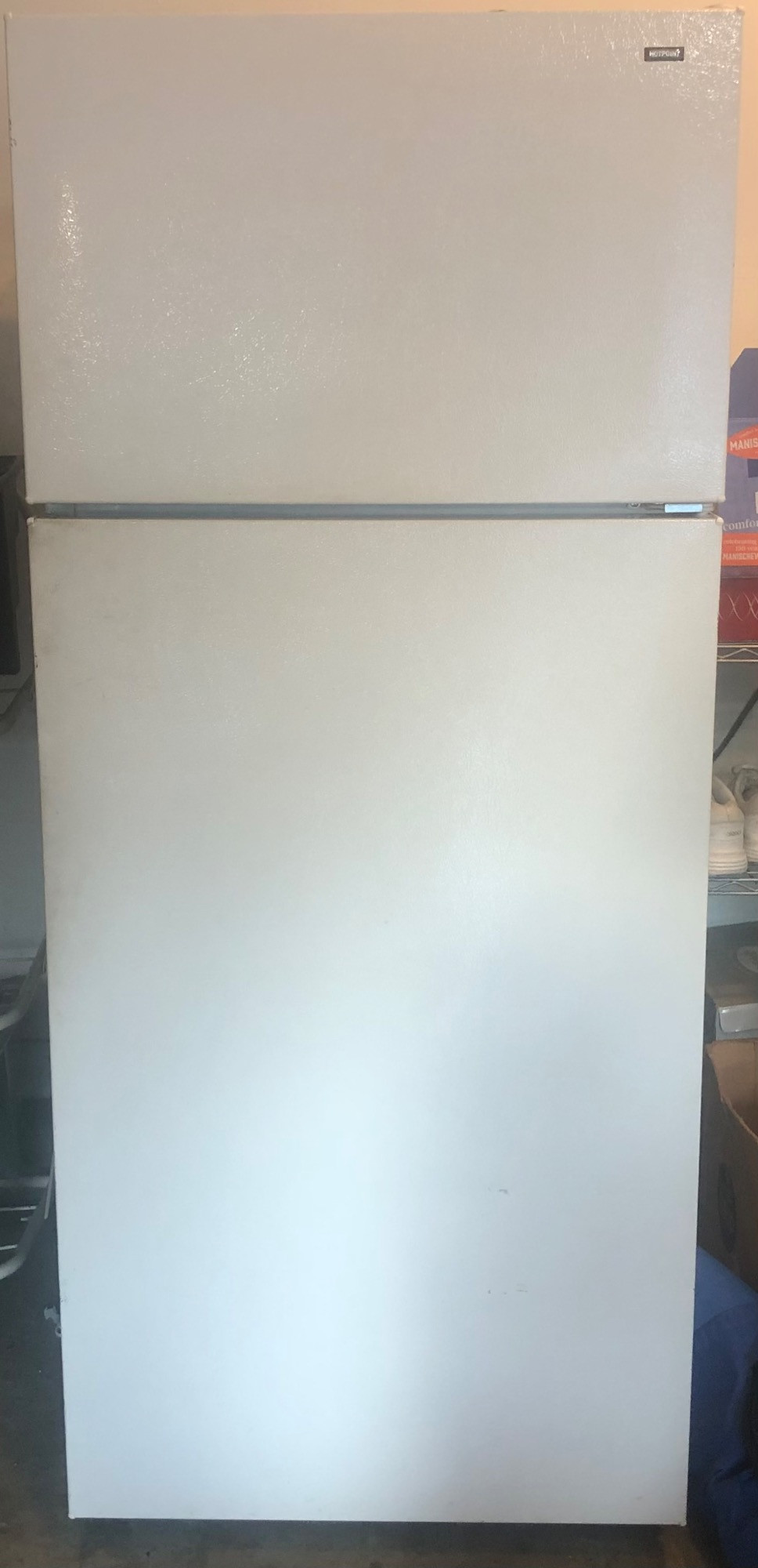 Refrigerator with door storage and vegetable keeper bin and 3 shelves and top freezer, also with door storage. Hotpoint. Located in garage. No stairs and direct access to driveway for convenient moving and loading. Bidding on this lot is an agreement that: (1.) You