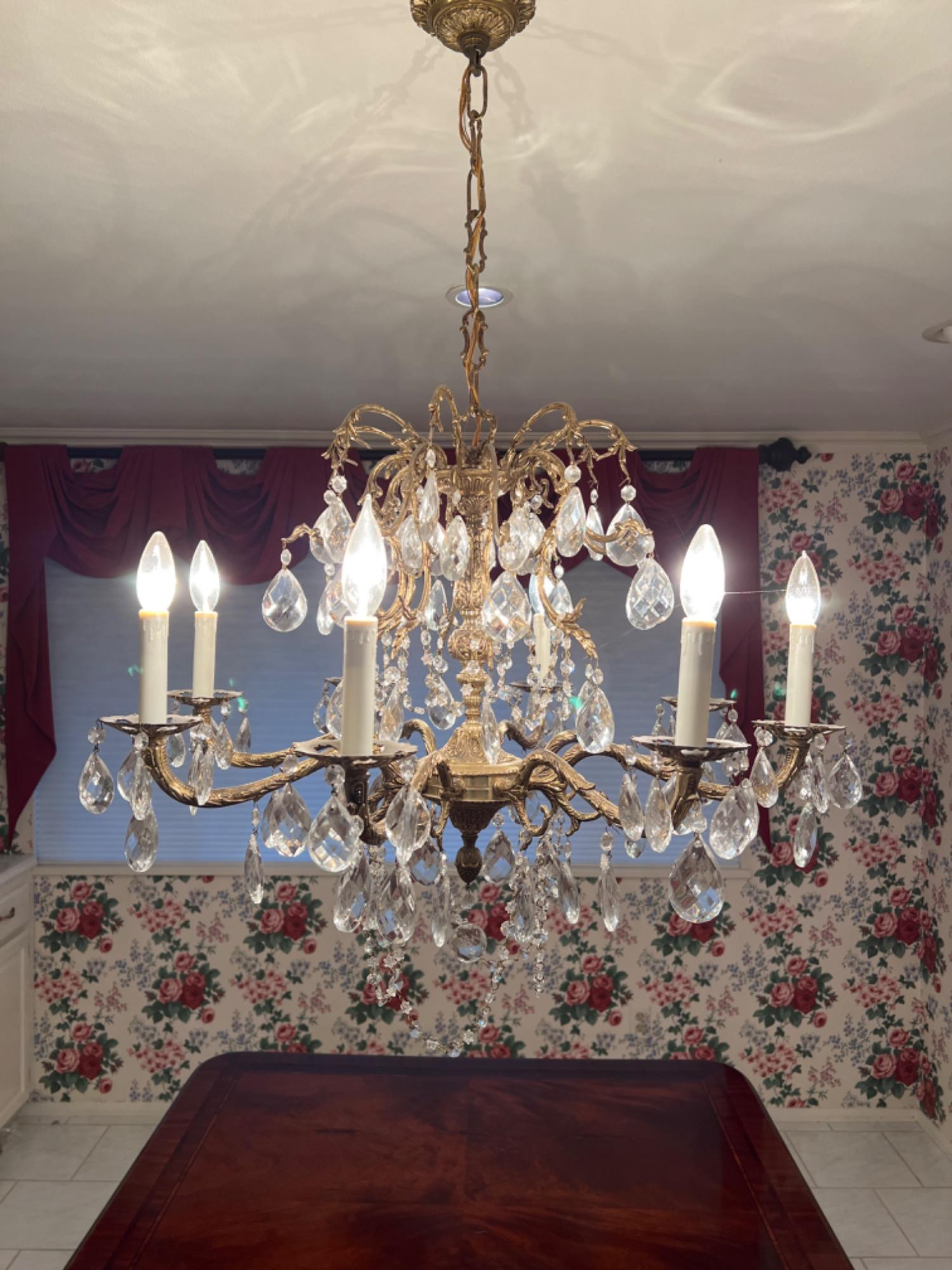 Extraordinary ceiling chandelier with 8 electric candles and teardrop crystals. Chain is 16.75 inches (there are a few more links available - see pic) Wall plate is approximately 5-5.5” diameter. Chandelier is installed in the ceiling and winning bidder agrees to bring the necessary tools and manpower to remove Overall chandelier measures: