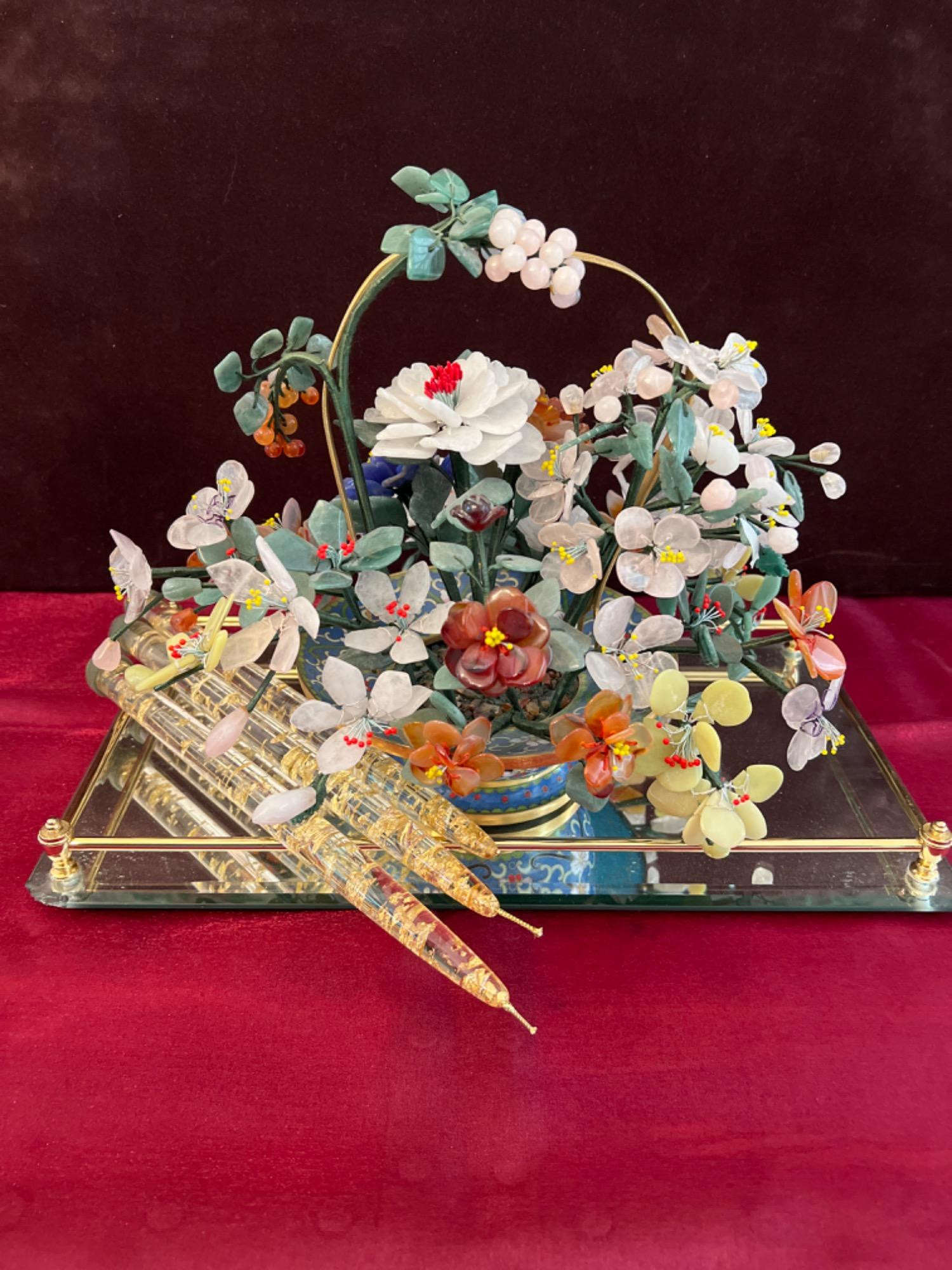 Lot # 172 - Chinese Cloisonne Basket & Semi Precious Stone Flowers & Lucite Tapers
