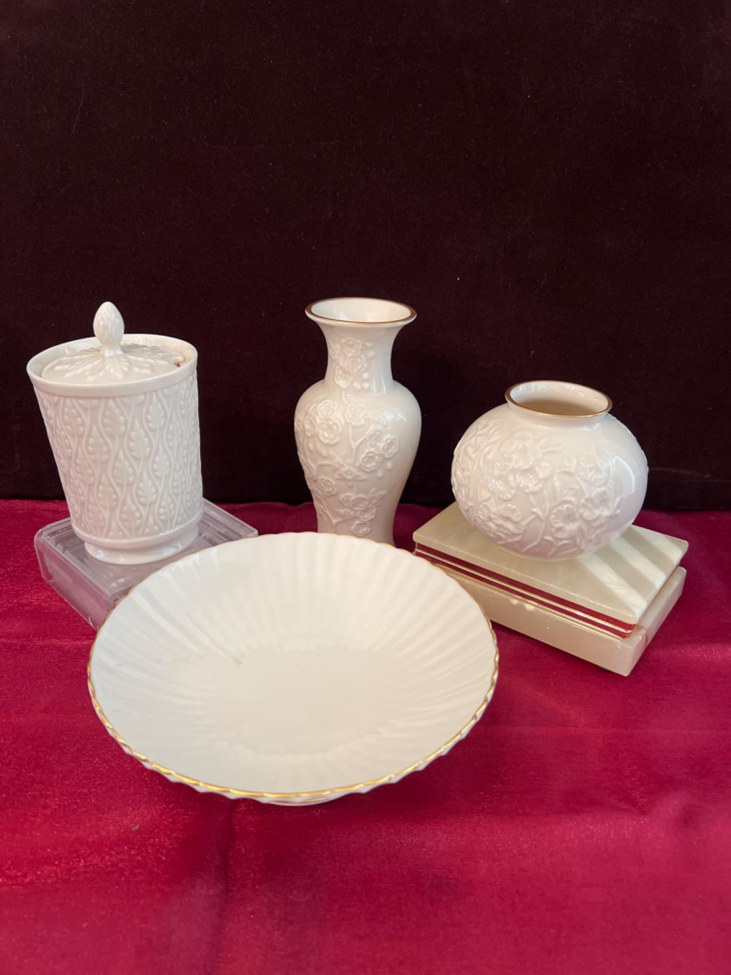 All Lenox - made in the USA: Soap pedestal dish or condiment/candy dish 7” round x 2.25” tall 7” tall embossed floral vase & matching 4” tall vase 5” tall mid century geographic embossed sugar bowl